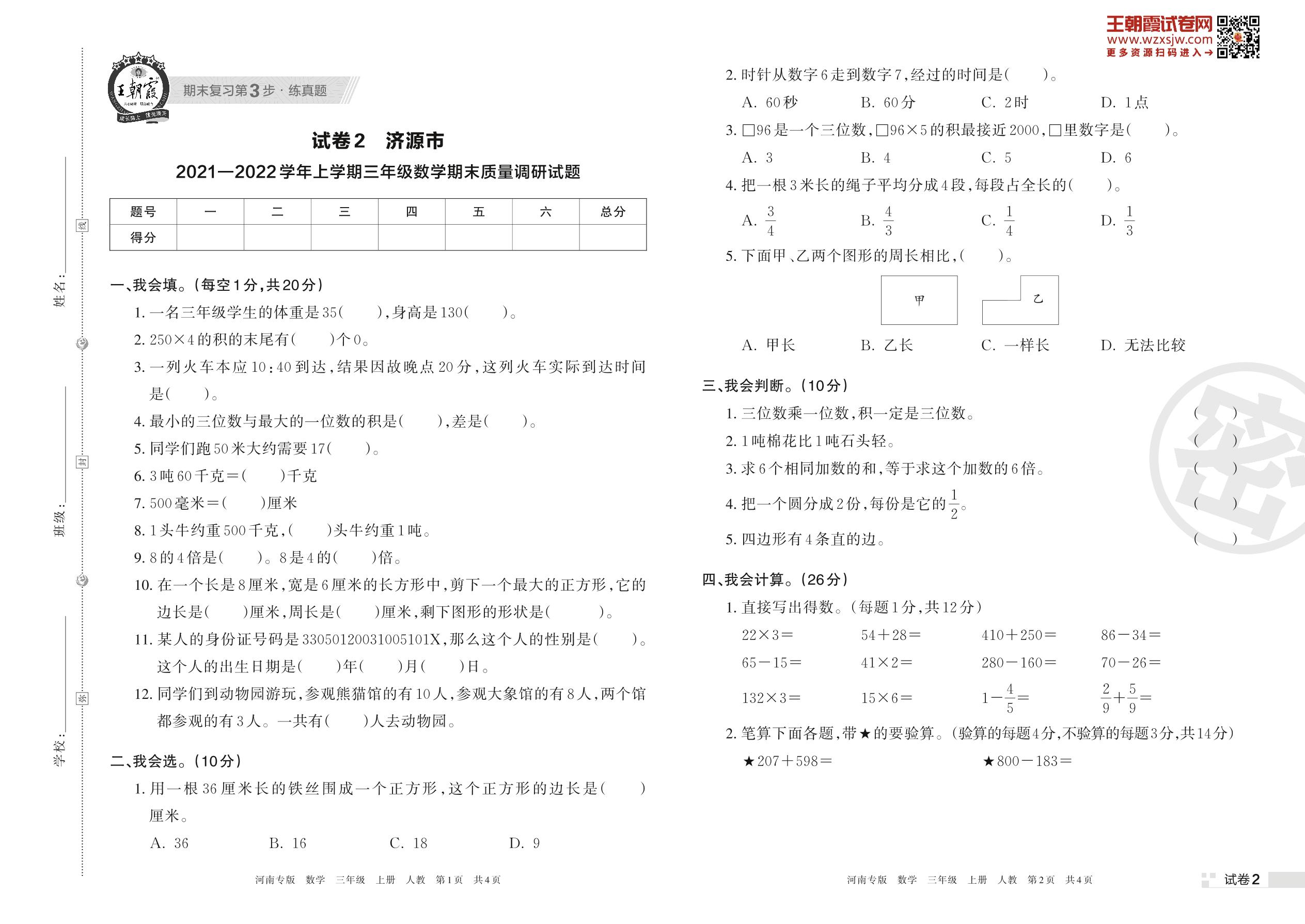 济源市2021—2022学年上学期三年级数学期末质量调研试题(人教版)【2】