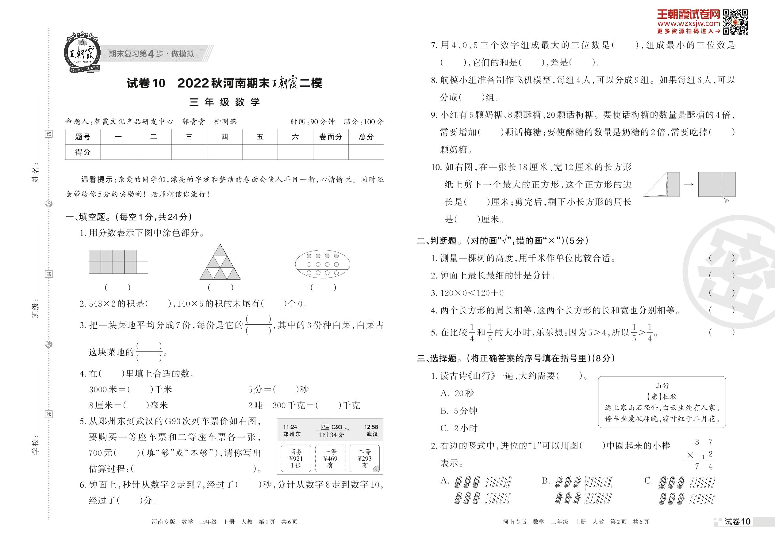 王朝霞期末模拟卷三年级上册数学(人教版)_R221111170422698【10】