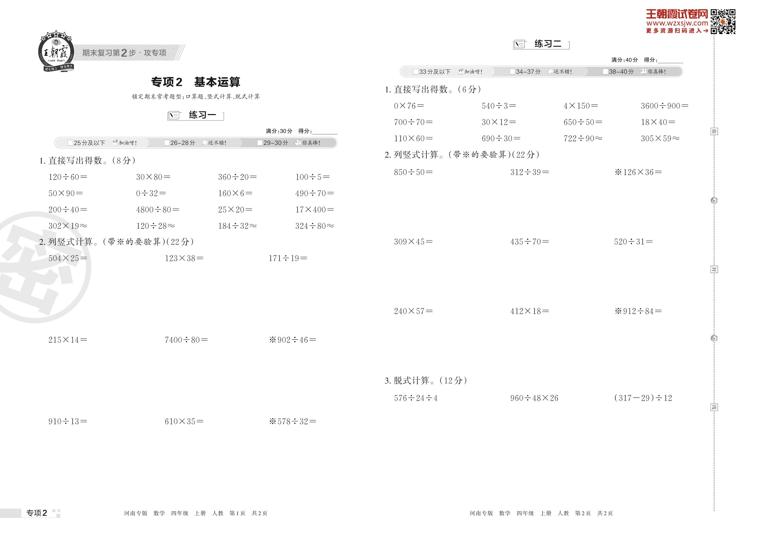 王朝霞期末专项卷——基本运算四年级上册数学(人教版)_R221111171802099【2】