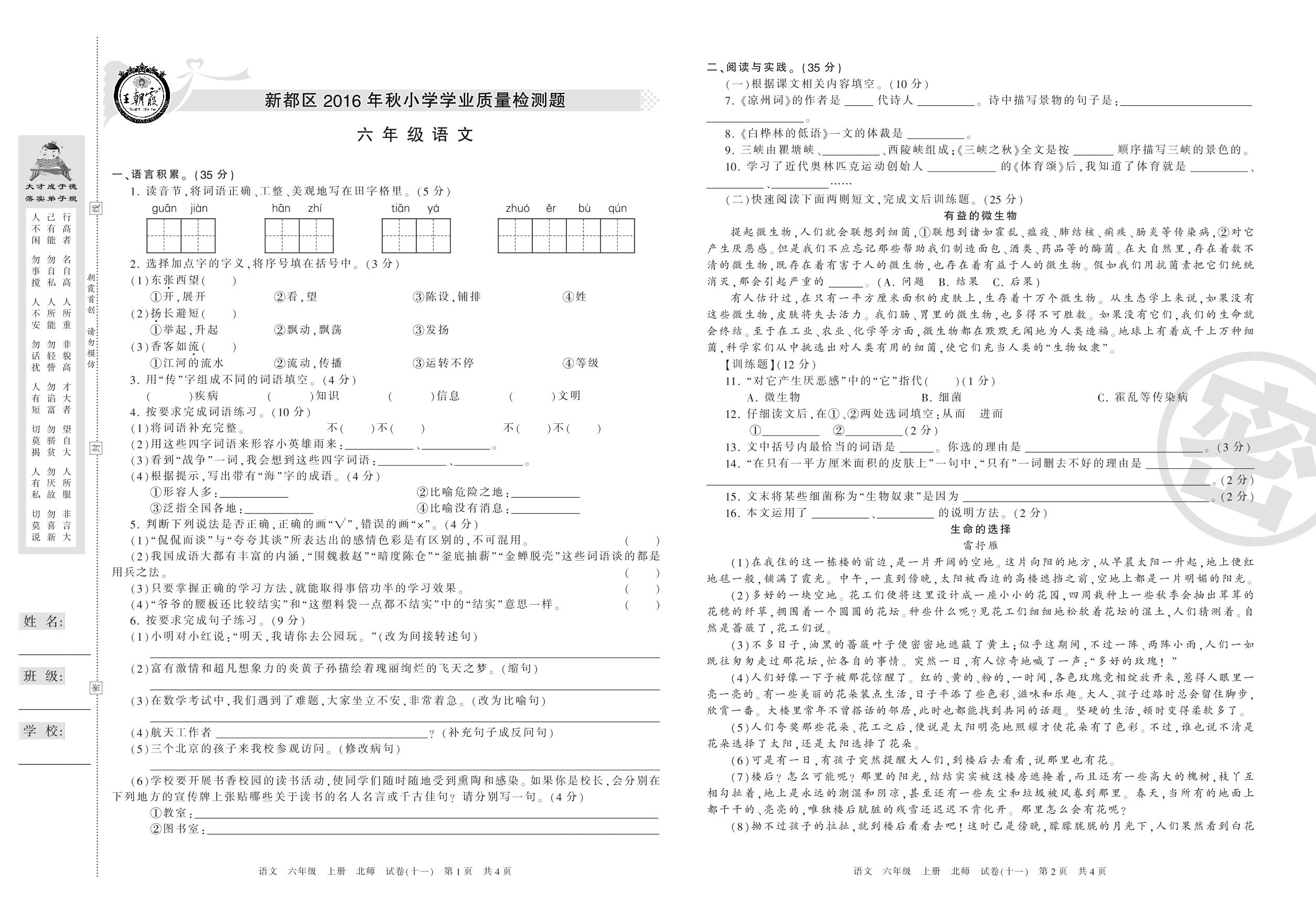 2016-2017学年第一学期成都市新都区六年级语文试卷(北师版)【11】