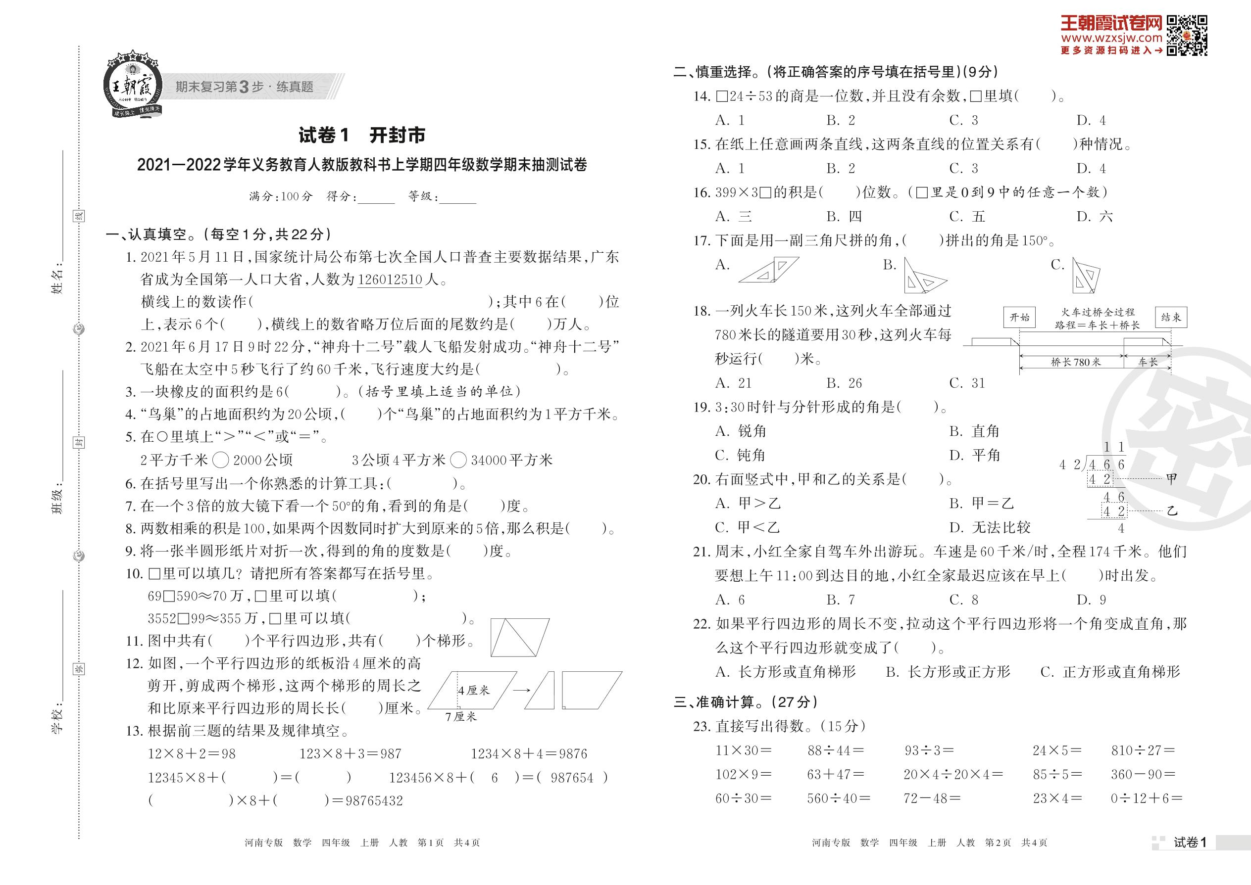 开封市2021—2022学年义务教育人教版教科书上学期四年级数学期末抽测试卷(人教版)【1】