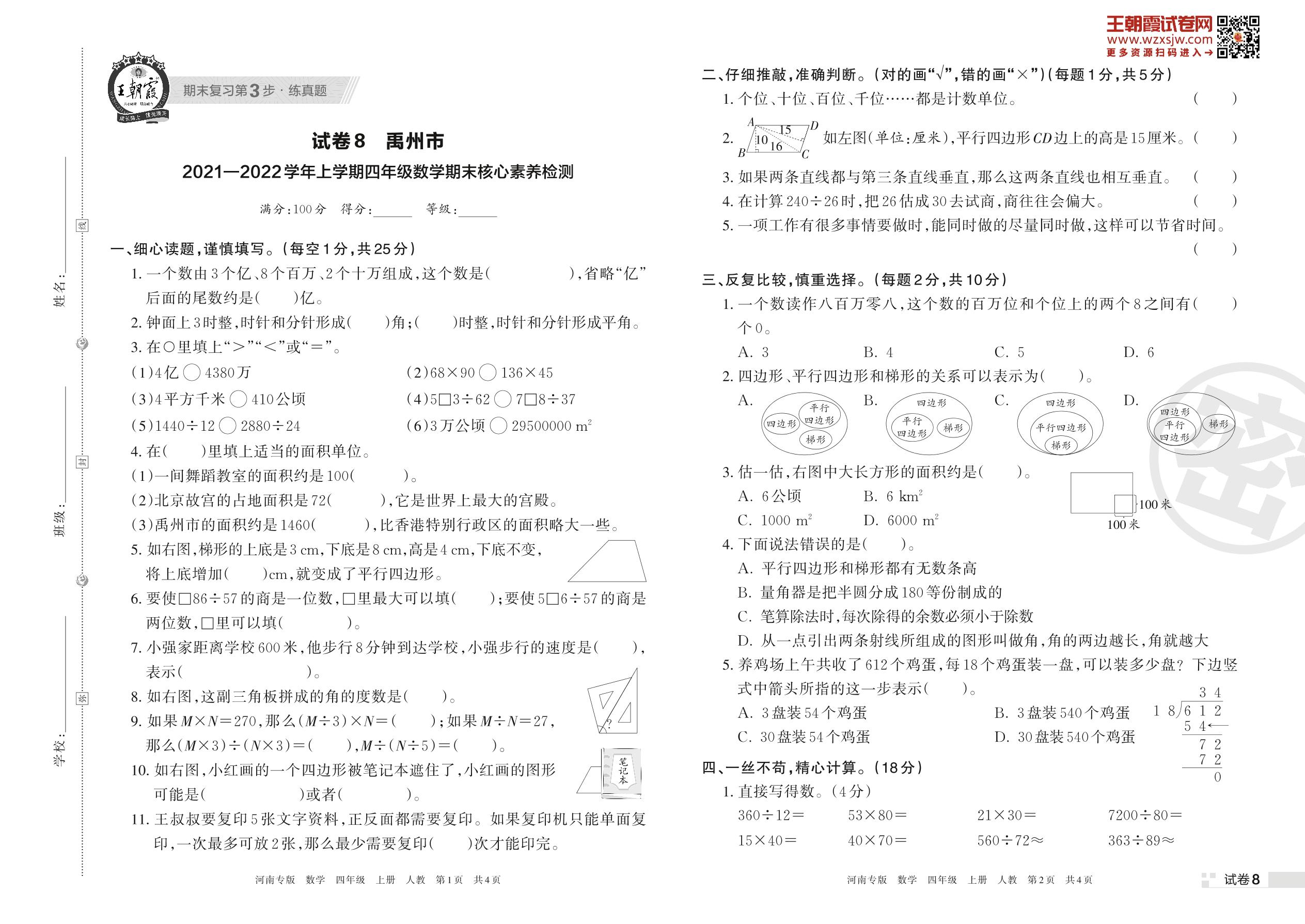 禹州市2021—2022学年上学期四年级数学期末核心素养检测(人教版)【8】
