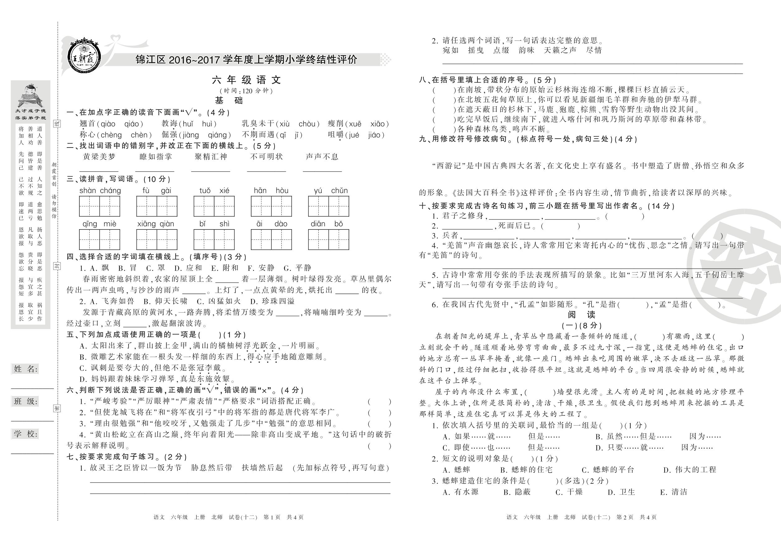 2016-2017学年第一学期成都市锦江区六年级语文试卷(北师版)【12】