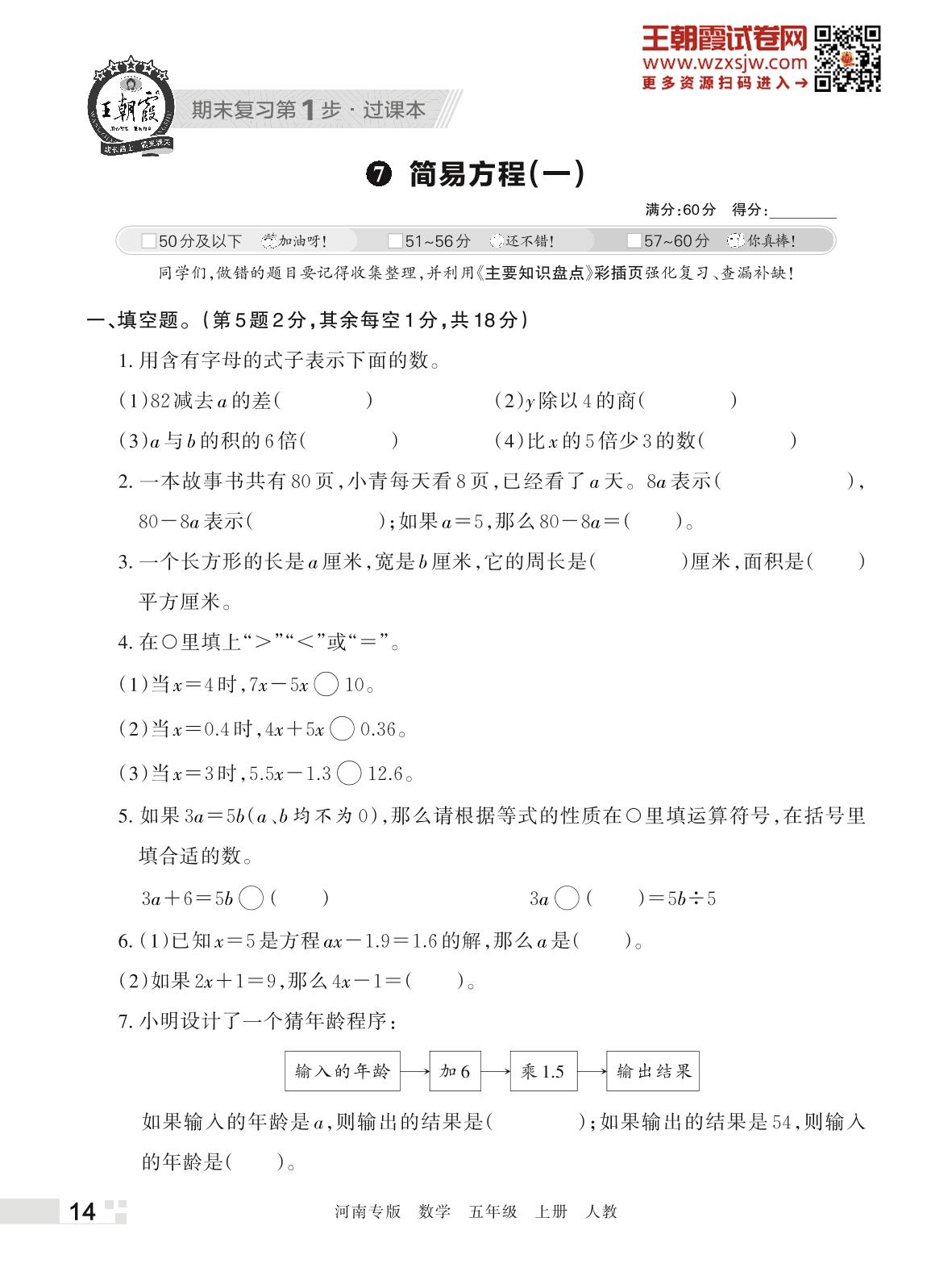 王朝霞期末过课本——7 简易方程(一)五年级上册数学(人教版)