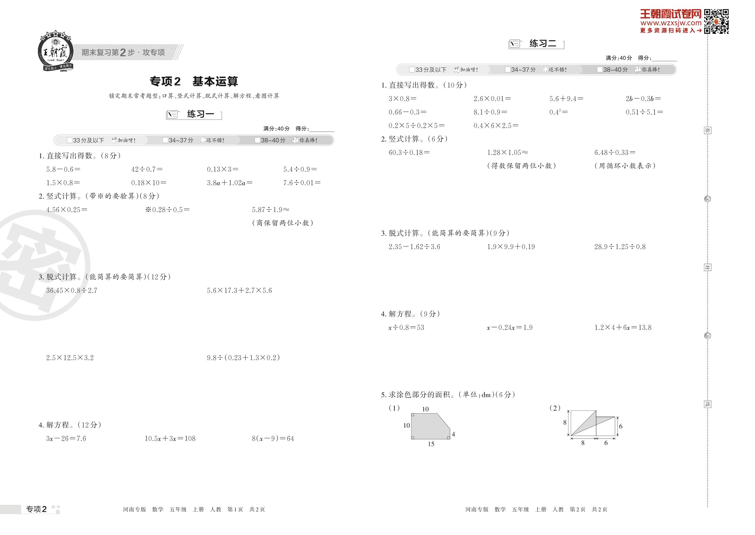 王朝霞期末专项卷——基本运算五年级上册数学(人教版)【2】