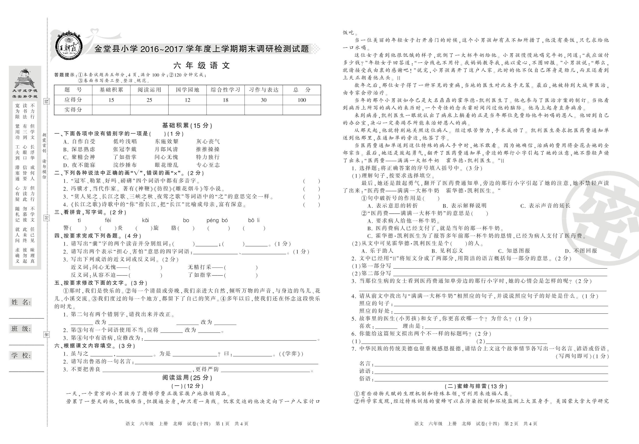 2016-2017学年第一学期成都市金堂县六年级语文试卷(北师版)【14】
