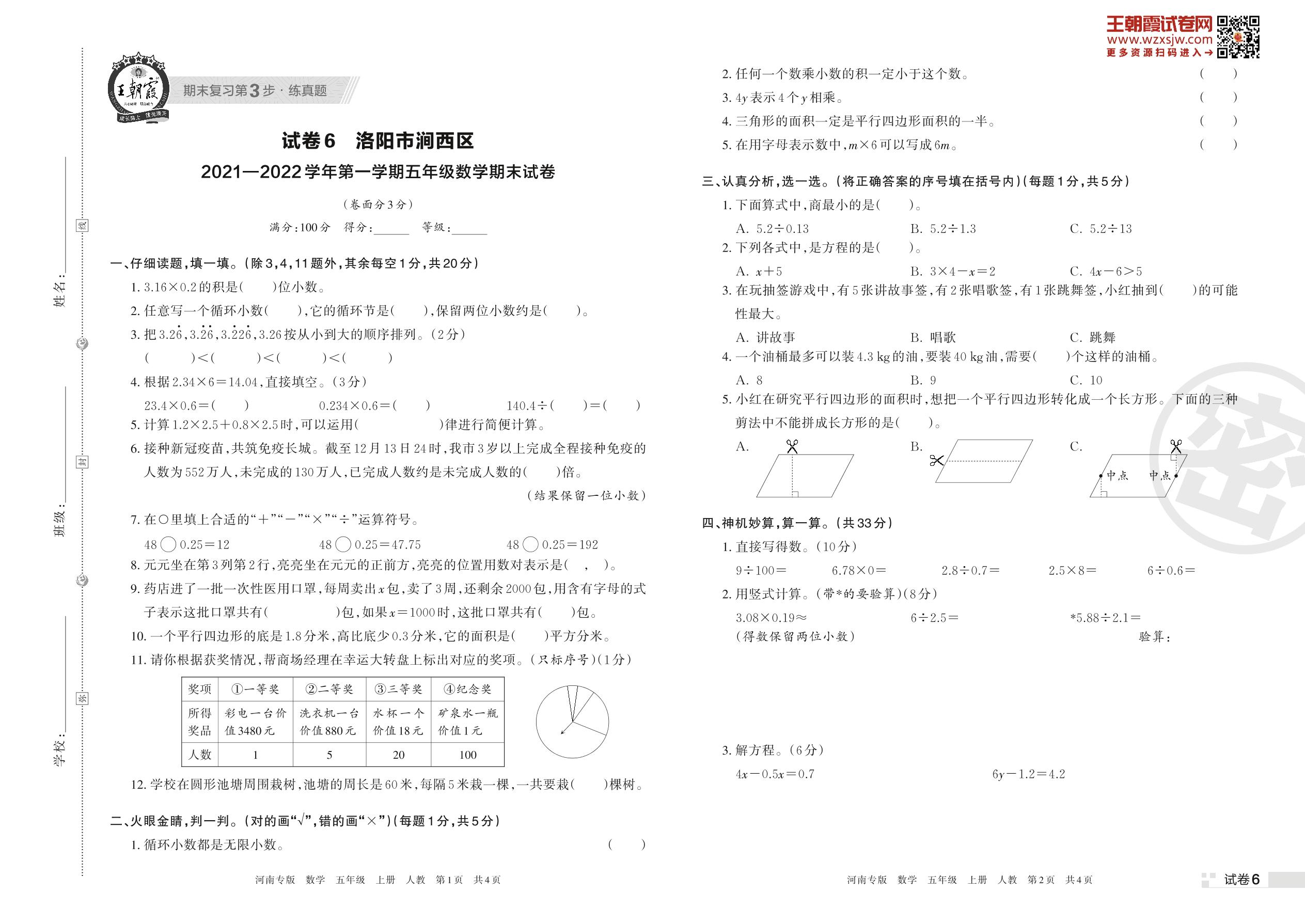 洛阳市涧西区2021—2022学年第一学期五年级数学期末试卷(人教版)【6】