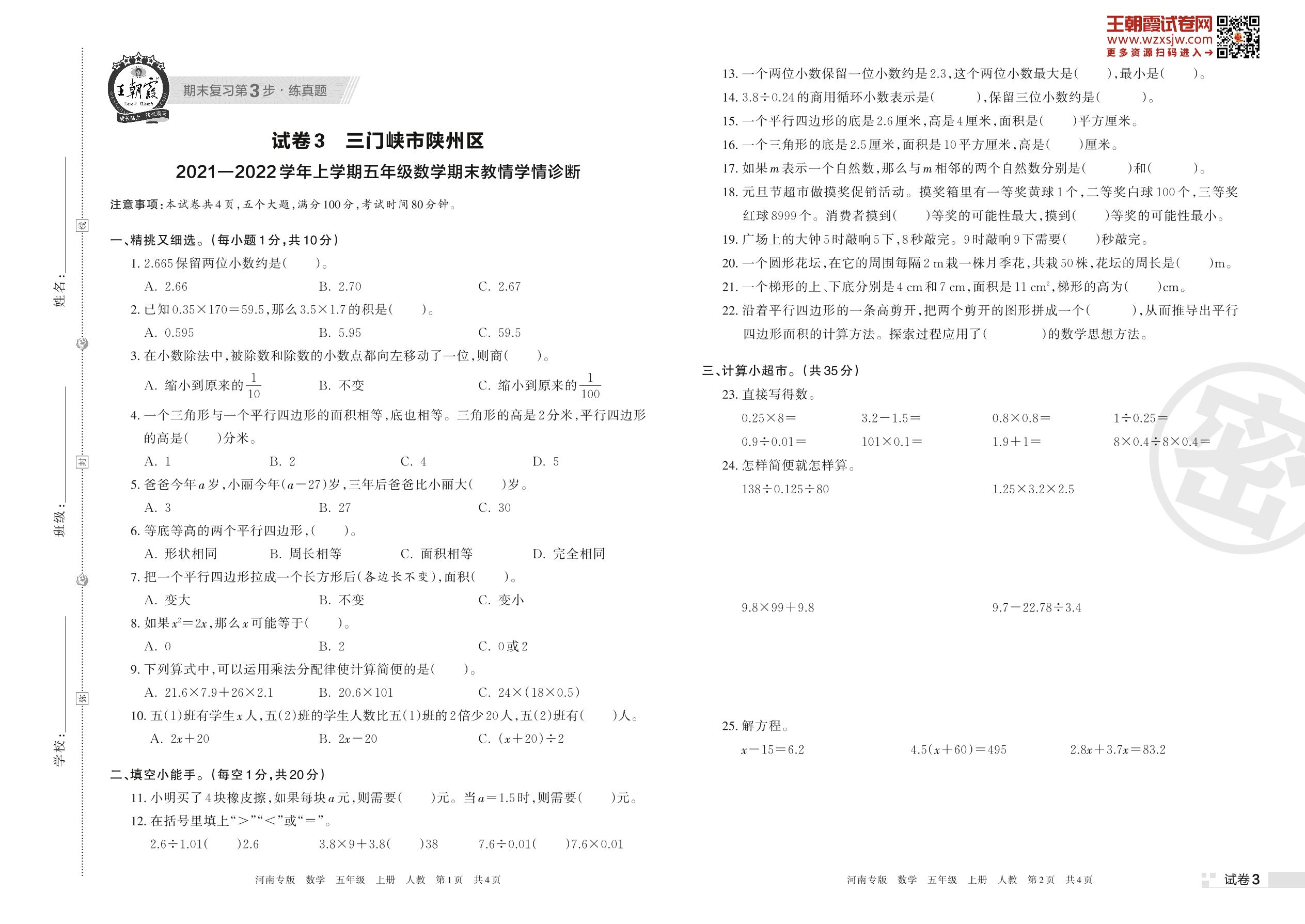 三门峡市陕州区2021—2022学年上学期五年级数学期末教情学情诊断(人教版)【3】