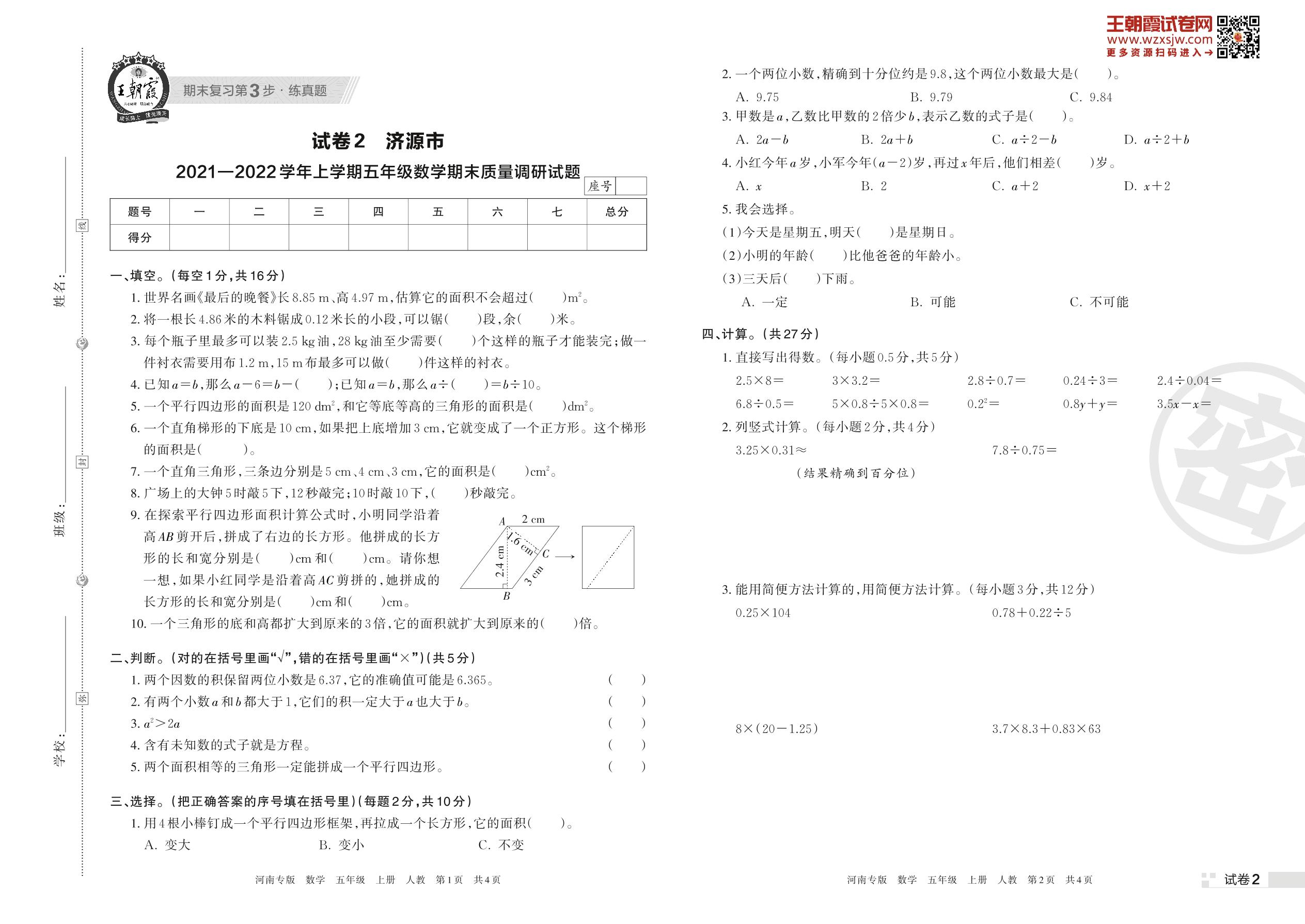 济源市2021—2022学年上学期五年级数学期末质量调研试题(人教版)【2】