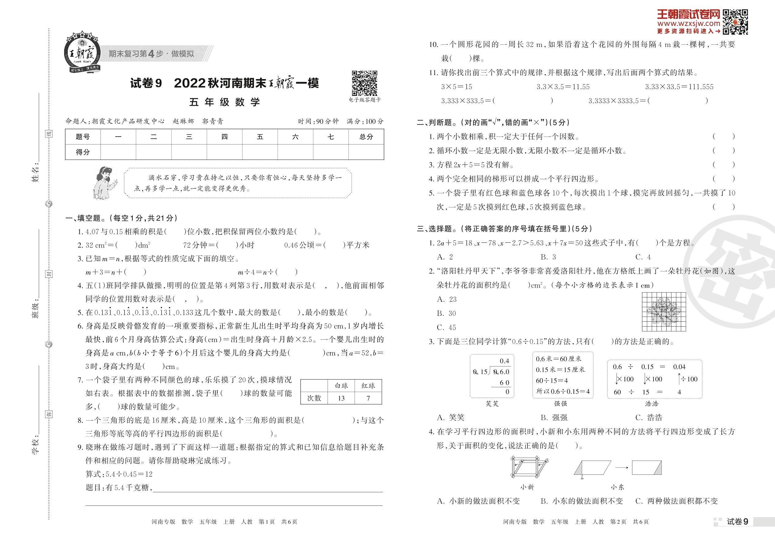 王朝霞期末模拟卷五年级上册数学(人教版)_R221111173121099【9】
