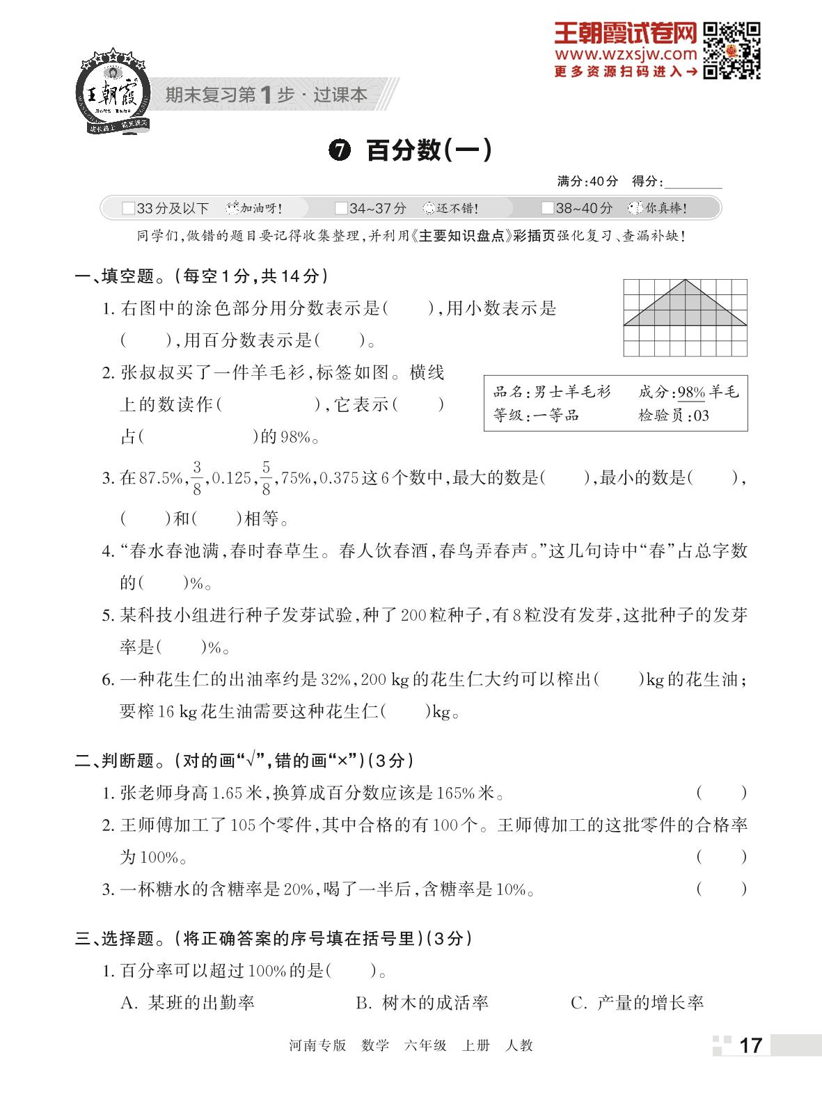 王朝霞期末过课本——7 百分数(一)六年级上册数学(人教版)