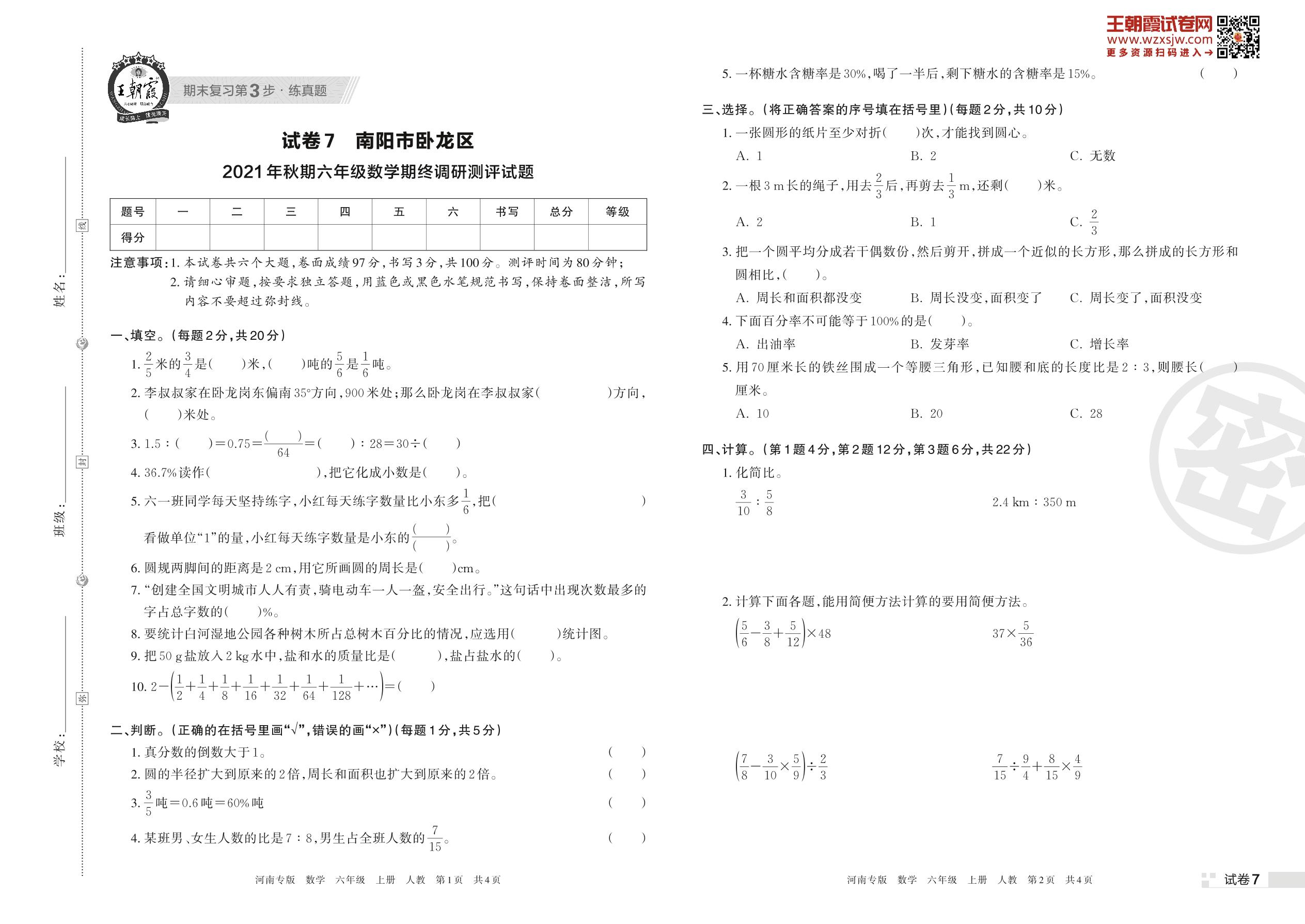 南阳市卧龙区2021年秋期六年级数学期终调研测评试题(人教版)【7】