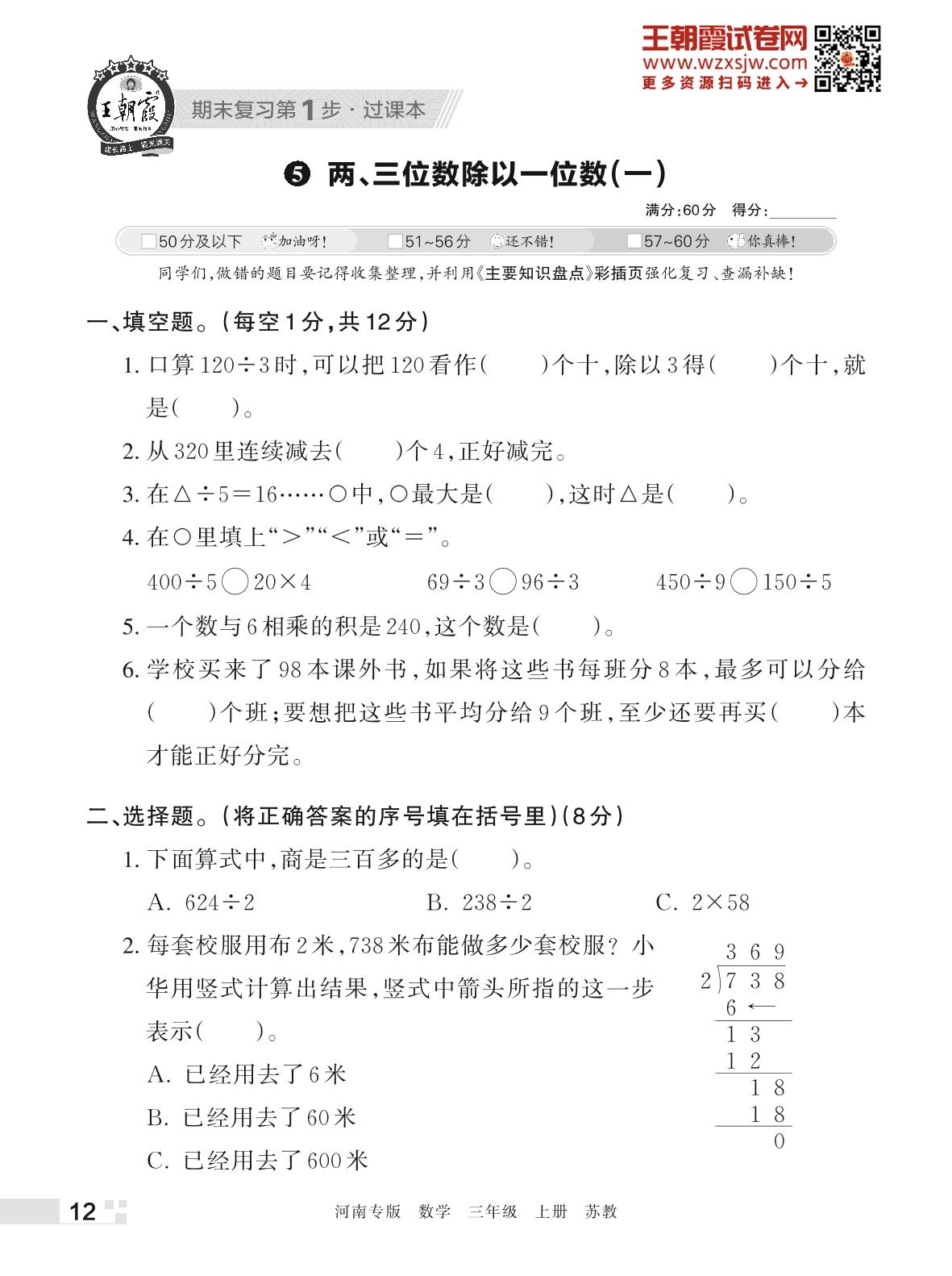 王朝霞期末过课本——5 两、三位数除以一位数(一)三年级上册数学(苏教版)_R221111174612931