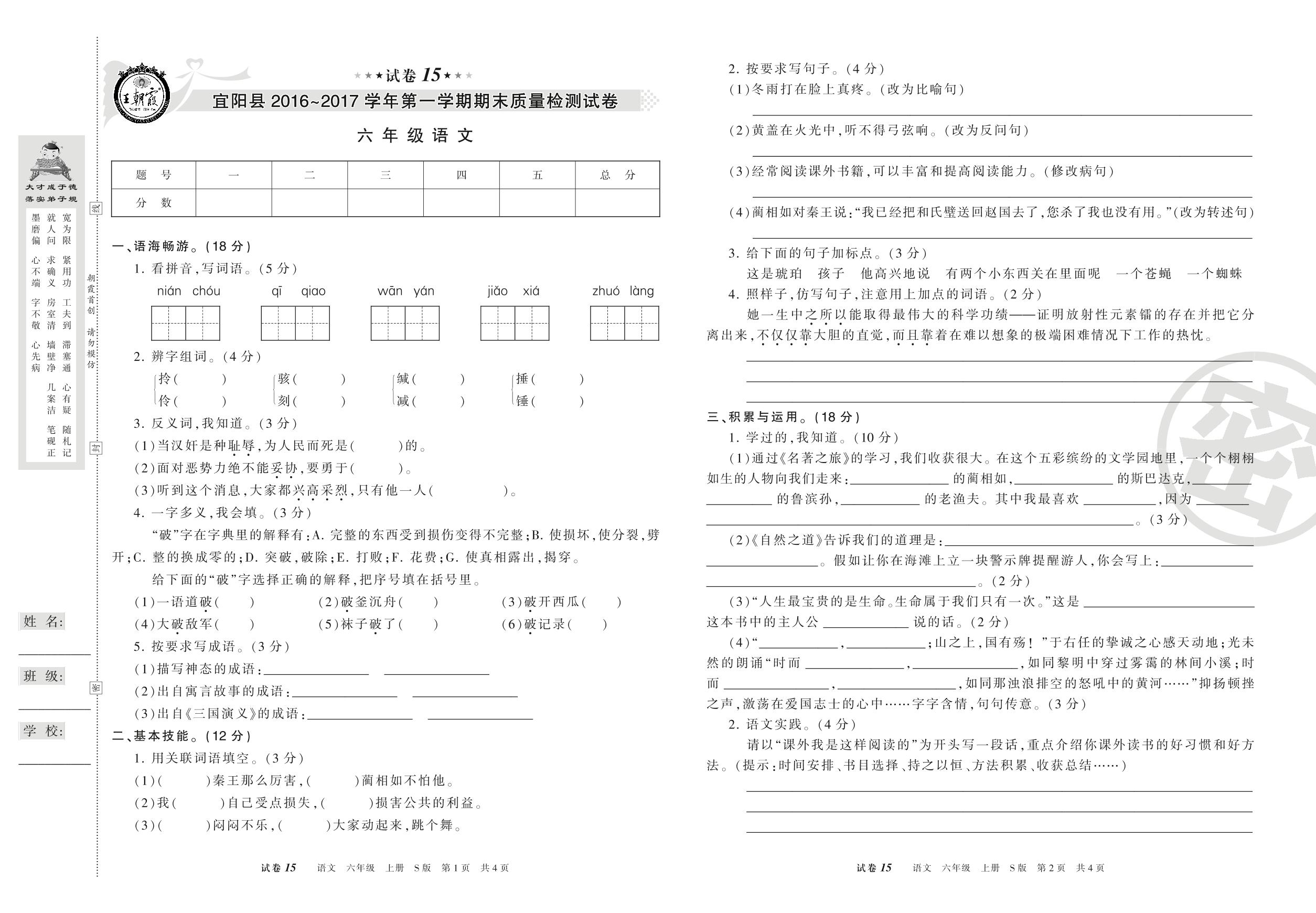 2016-2017学年第一学期洛阳市宜阳县六年级语文试卷(S版)【15】