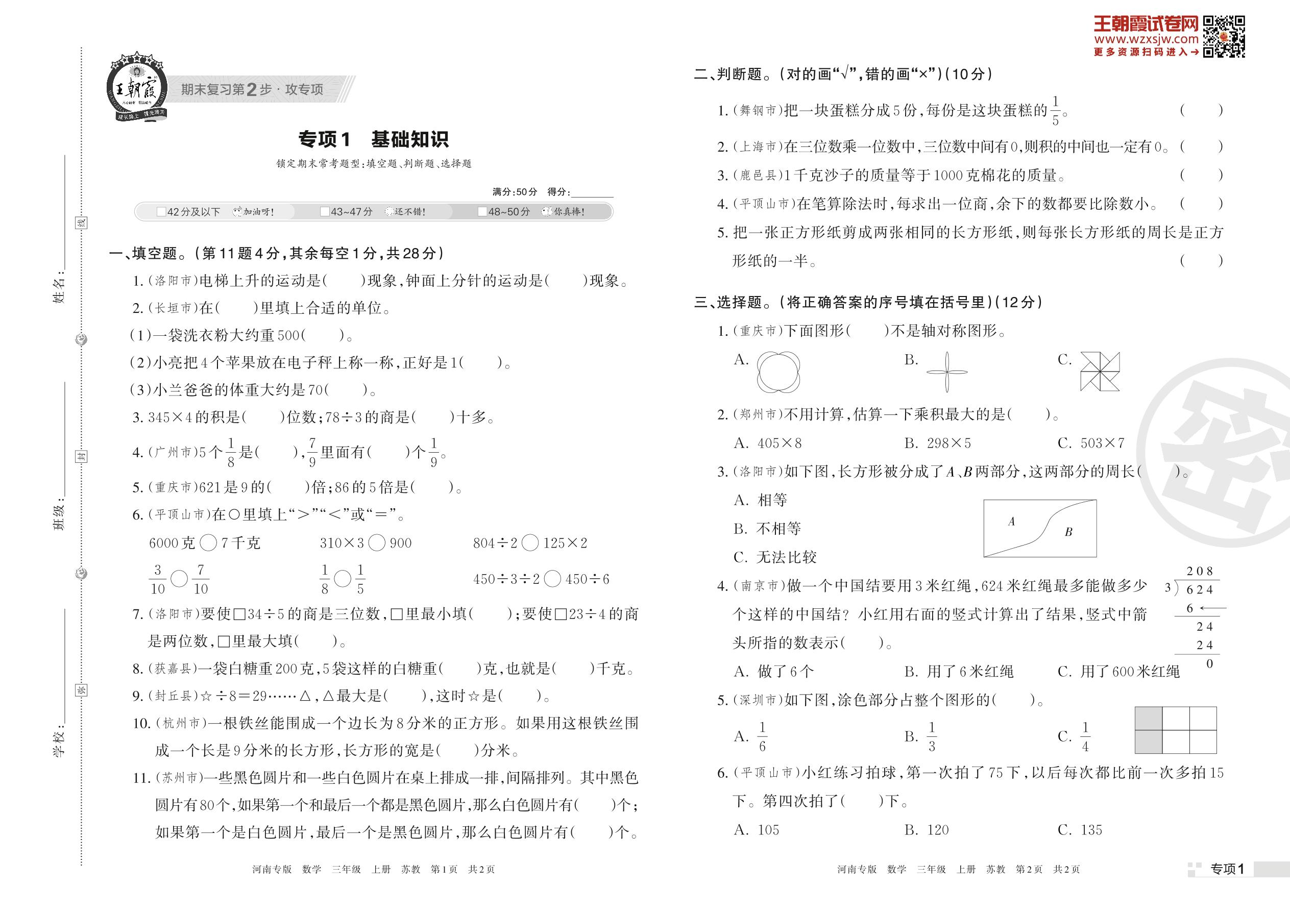王朝霞期末专项卷——基础知识三年级上册数学(苏教版)_R221111174614464【1】