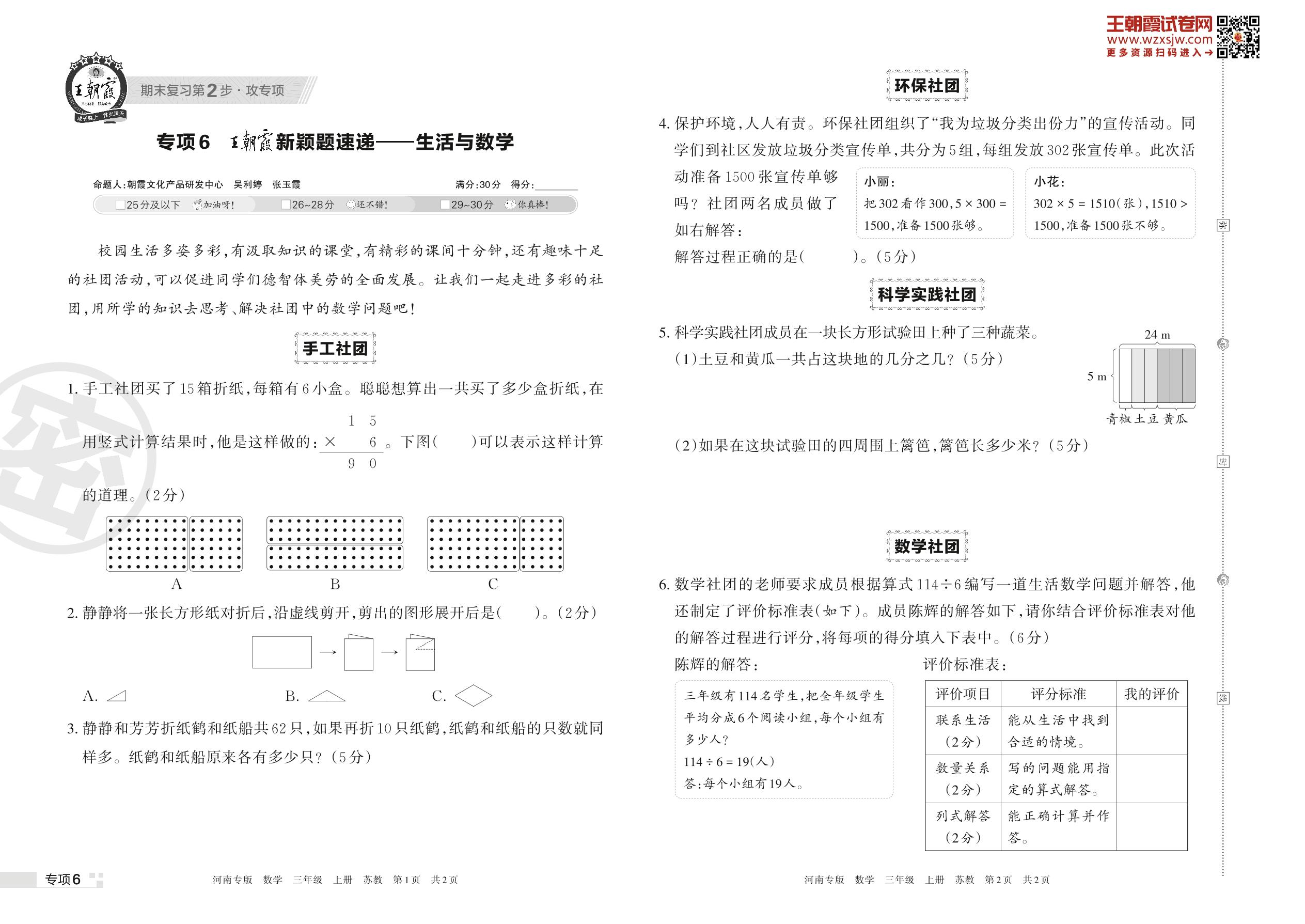 王朝霞期末专项卷——王朝霞新颖题速递:生活与数学三年级上册数学(苏教版)_R221111174614507【6】