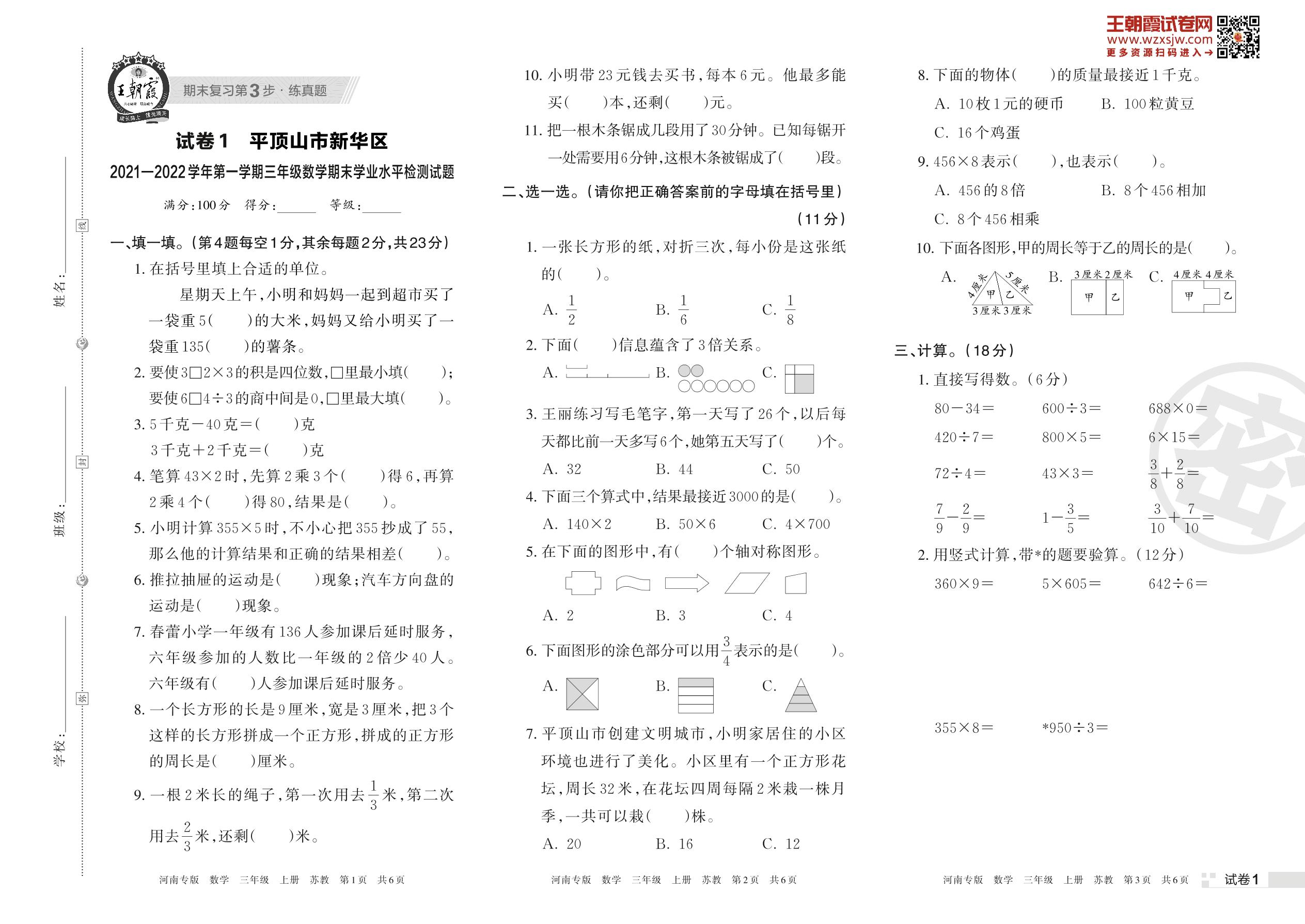 平顶山市新华区2021—2022学年第一学期三年级数学期末学业水平检测试题(苏教版)【1】