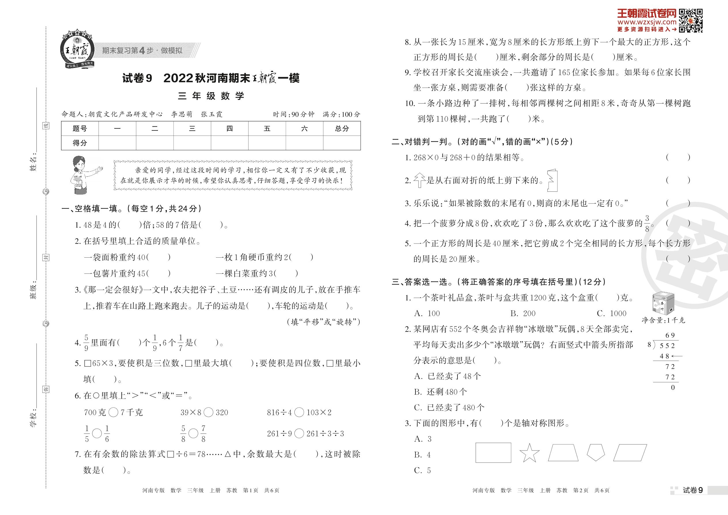 王朝霞期末模拟卷三年级上册数学(苏教版)_R221111174616933【9】