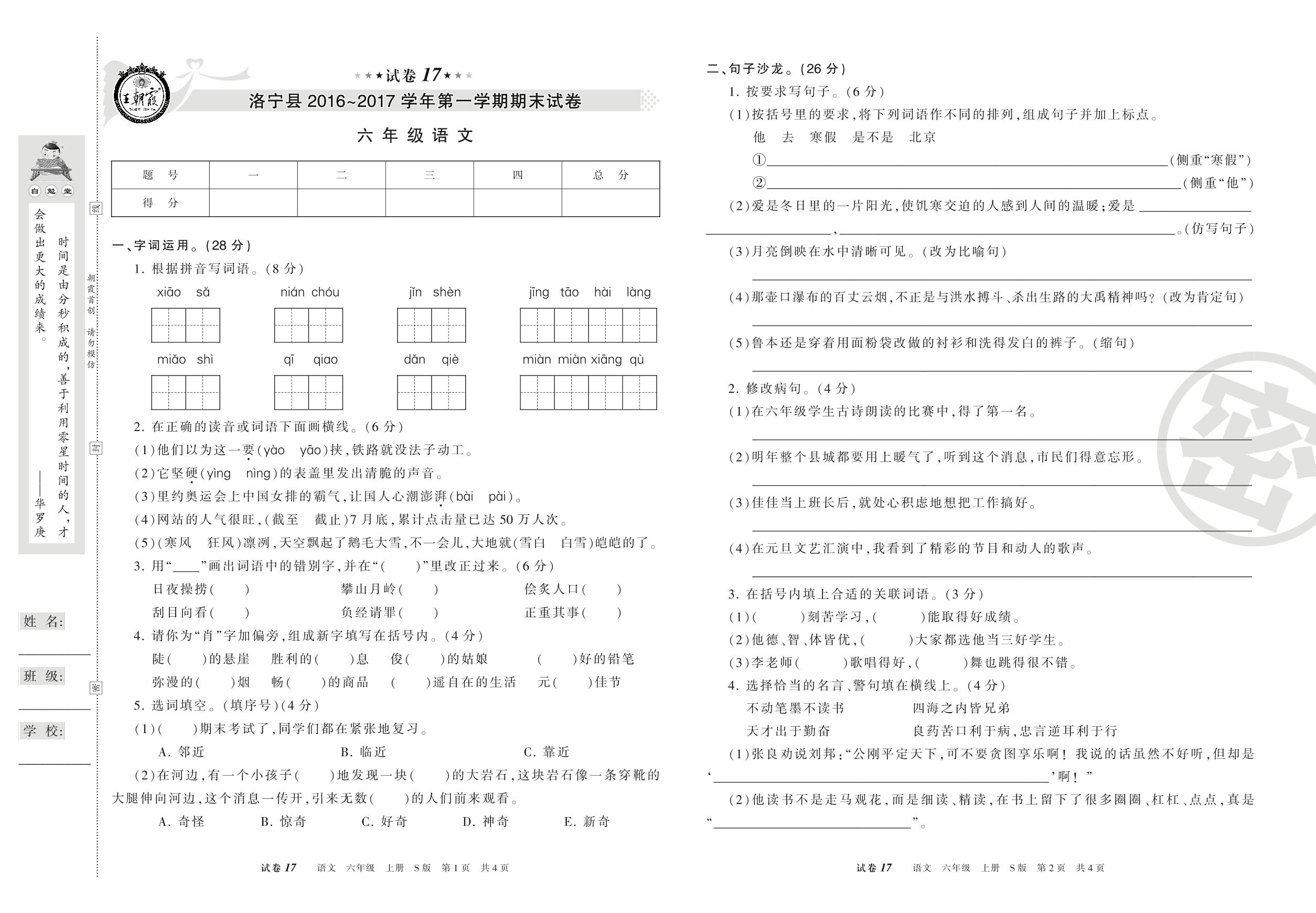 2016-2017学年第一学期洛阳市洛宁县六年级语文试卷(S版)【17】