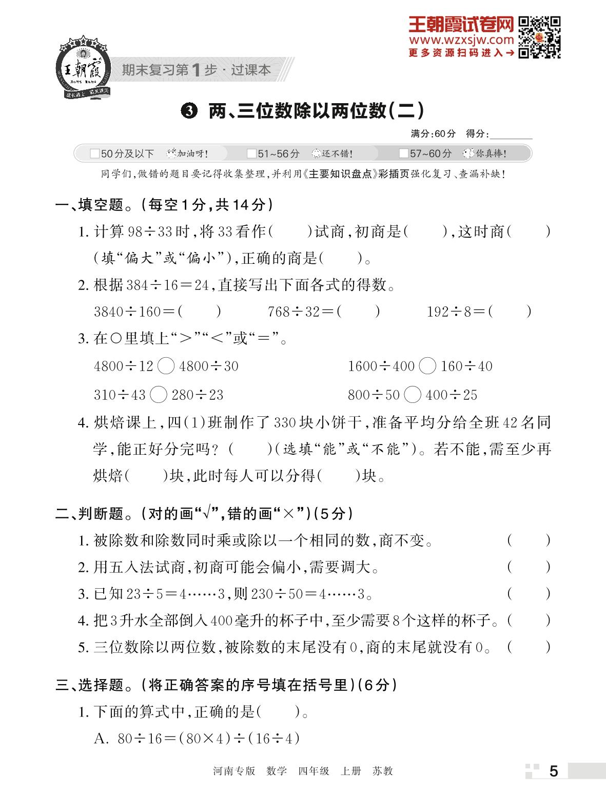 王朝霞期末过课本——3 两、三位数除以两位数(二)四年级上册数学(苏教版)_R221111175311211