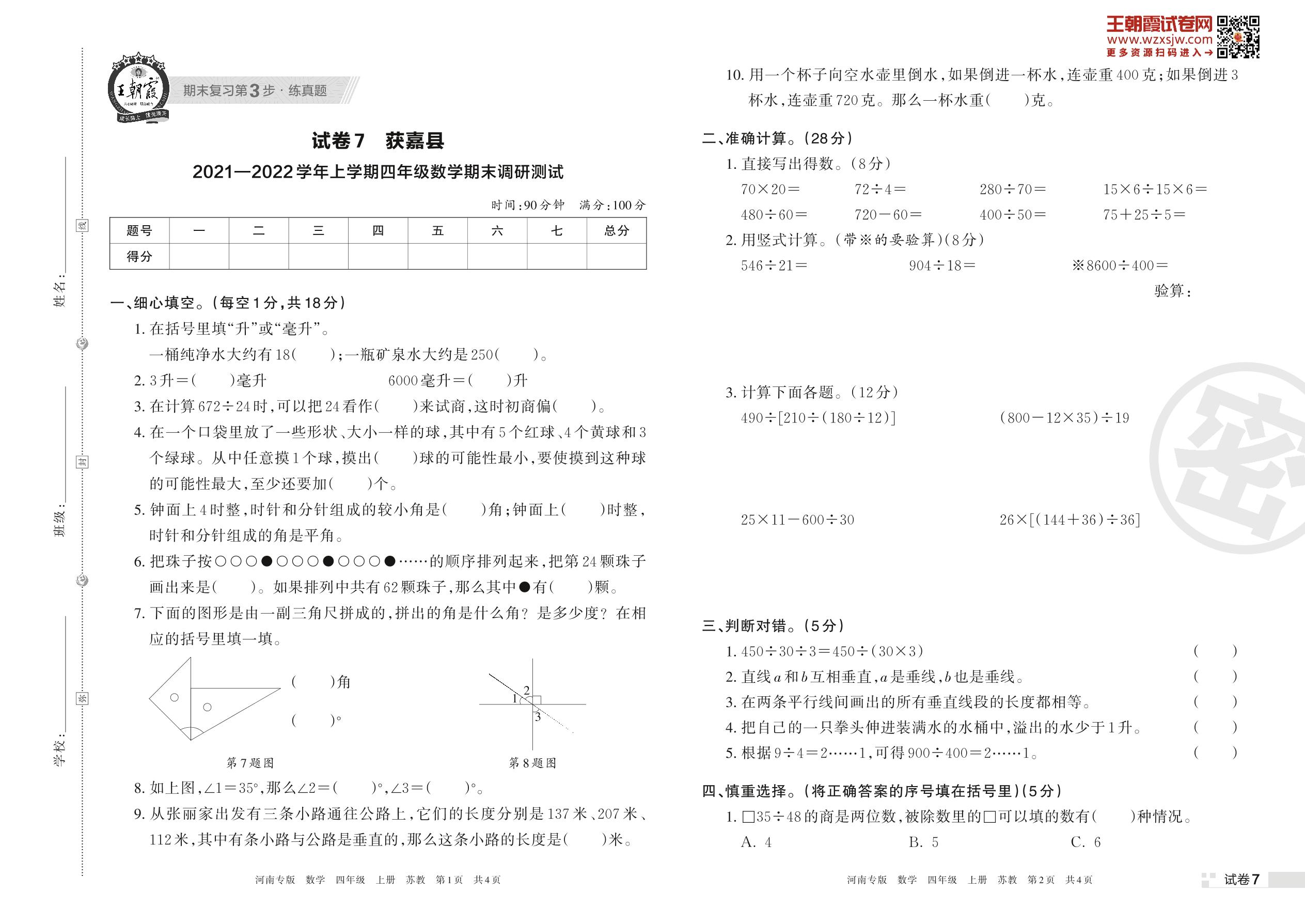 获嘉县2021—2022学年上学期四年级数学期末调研测试(苏教版)【7】