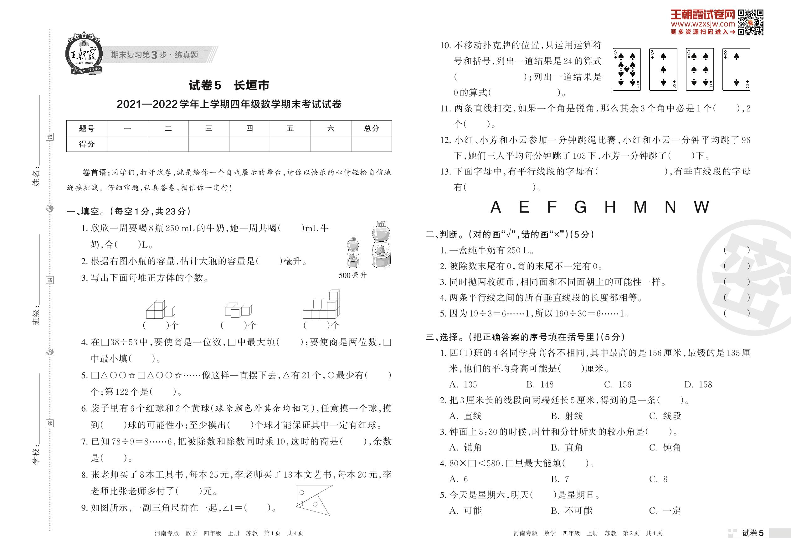 长垣市2021—2022学年上学期四年级数学期末考试试卷(苏教版)【5】