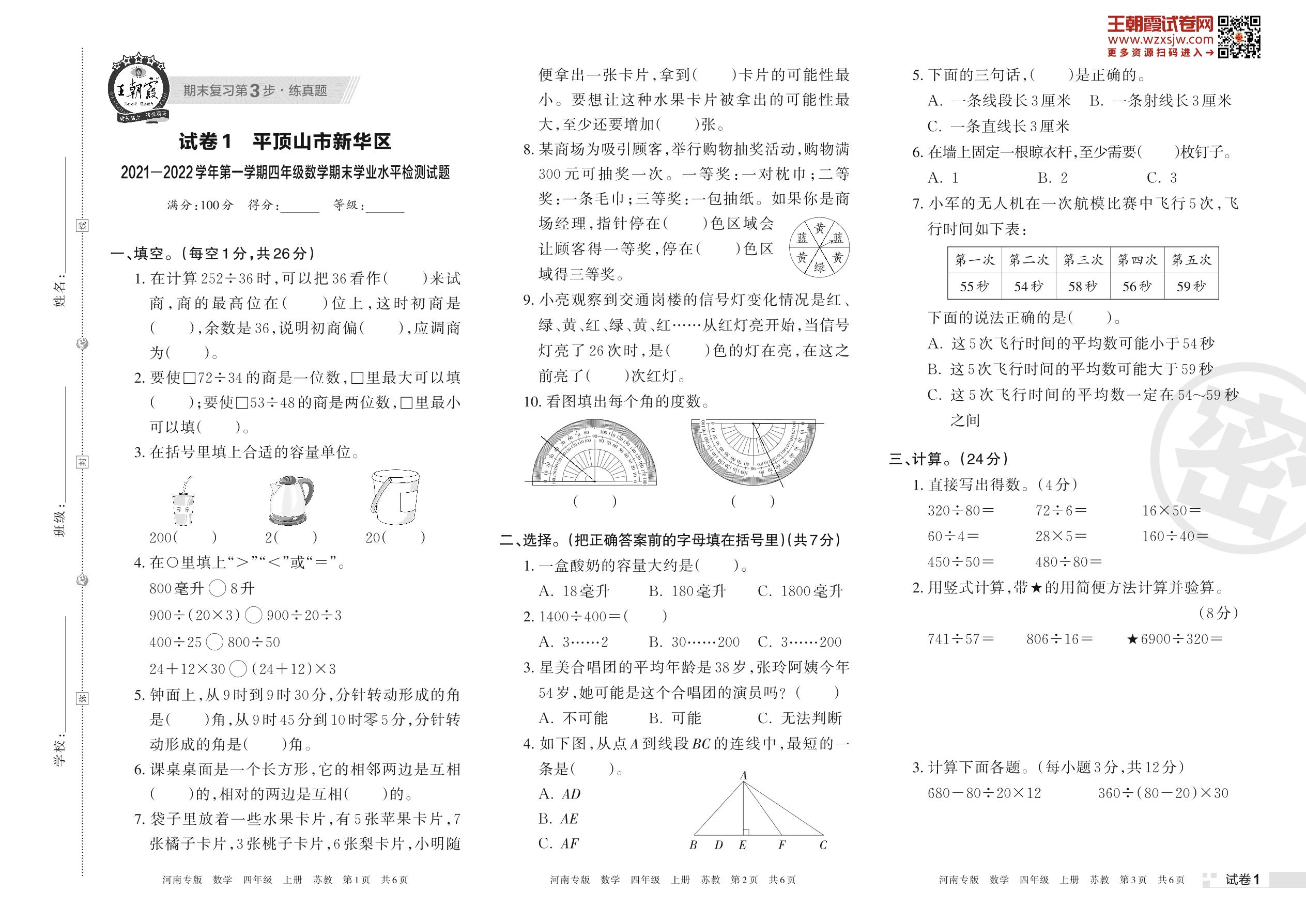 平顶山市新华区2021—2022学年第一学期四年级数学期末学业水平检测试题(苏教版)【1】
