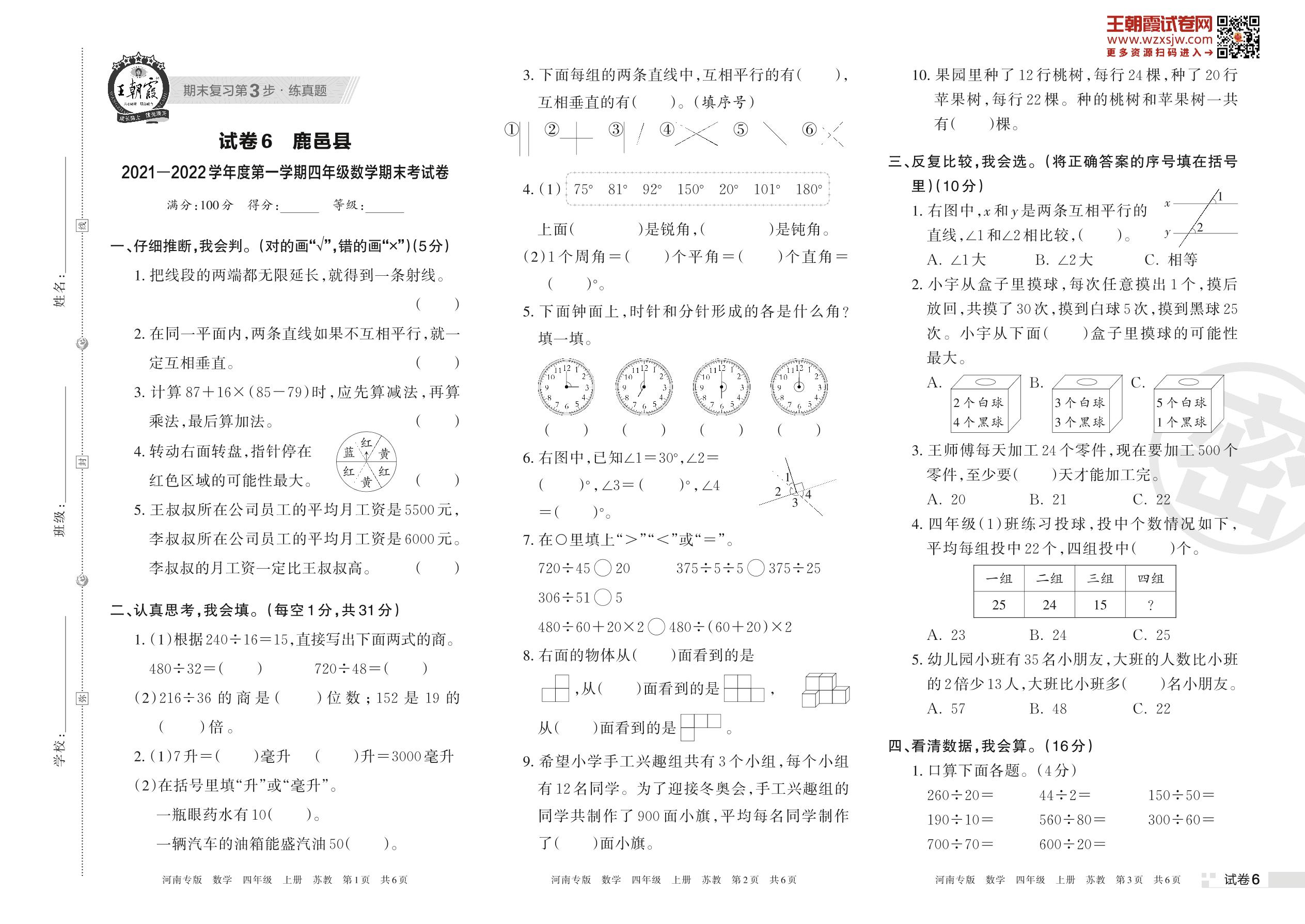鹿邑县2021—2022学年度第一学期四年级数学期末考试卷(苏教版)【6】
