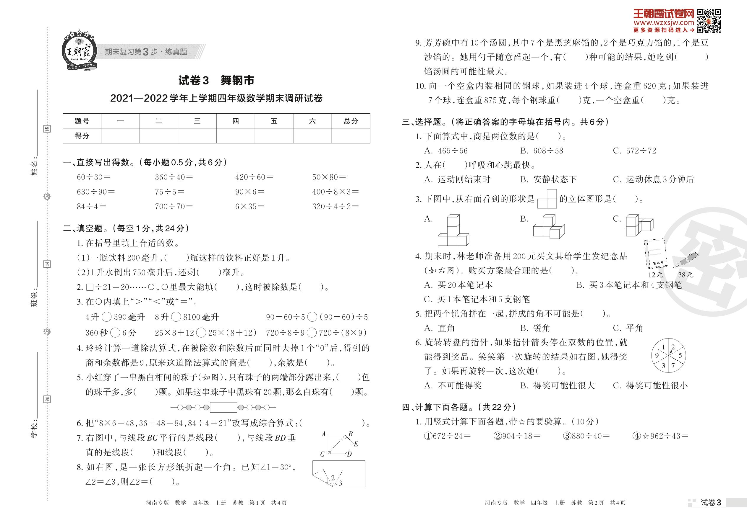 舞钢市2021—2022学年上学期四年级数学期末调研试卷(苏教版)【3】