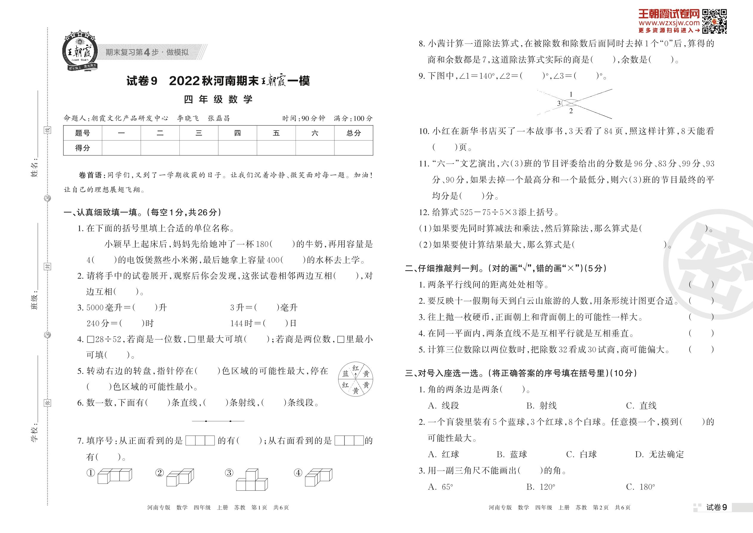 王朝霞期末模拟卷四年级上册数学(苏教版)_R221111175313579【9】