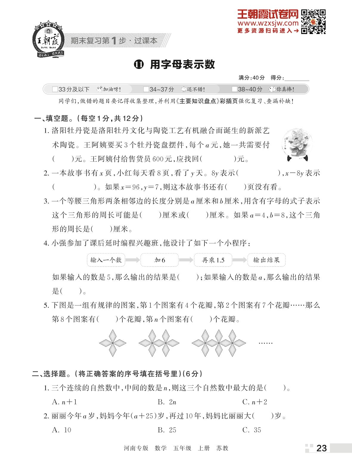 王朝霞期末过课本——11 用字母表示数五年级上册数学(苏教版)_R221111180011621