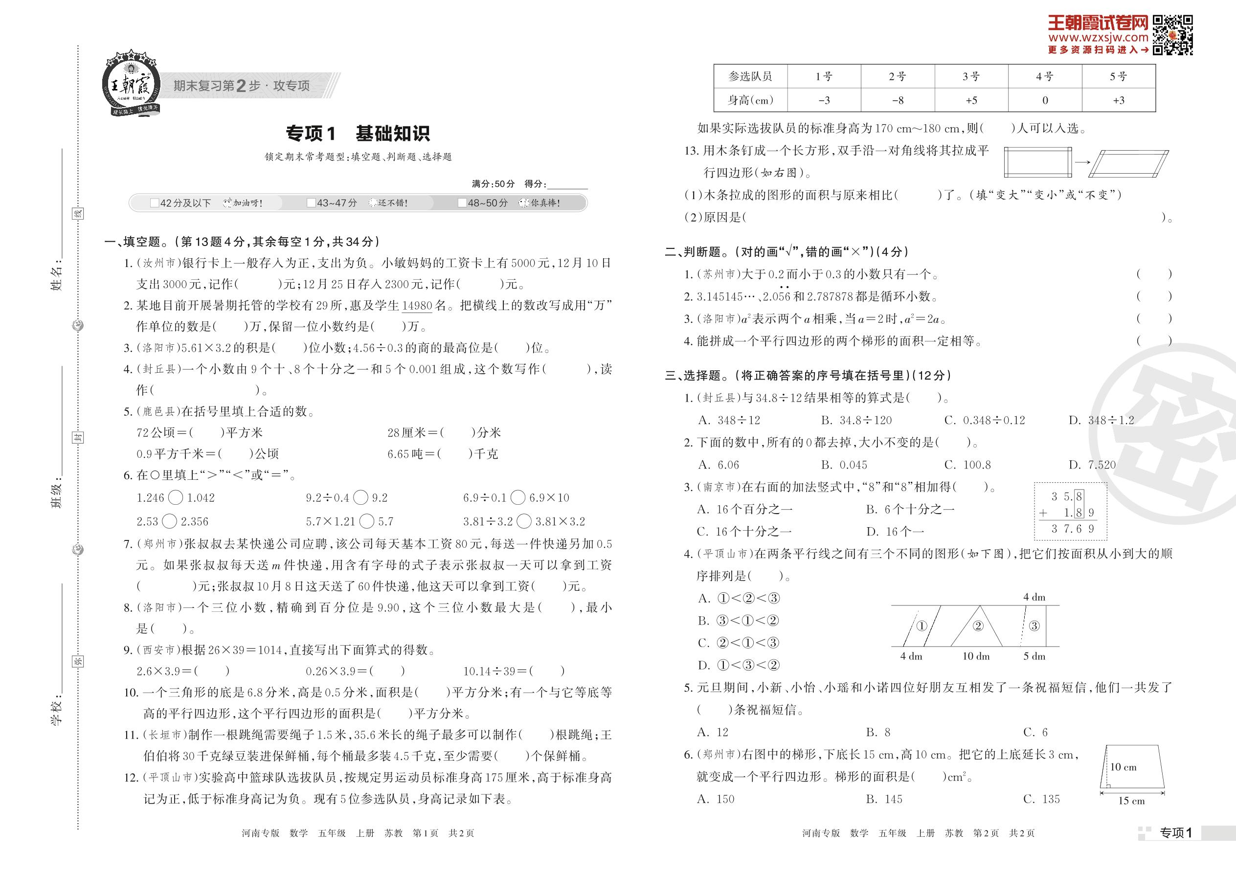王朝霞期末专项卷——基础知识五年级上册数学(苏教版)_R221111180012694【1】