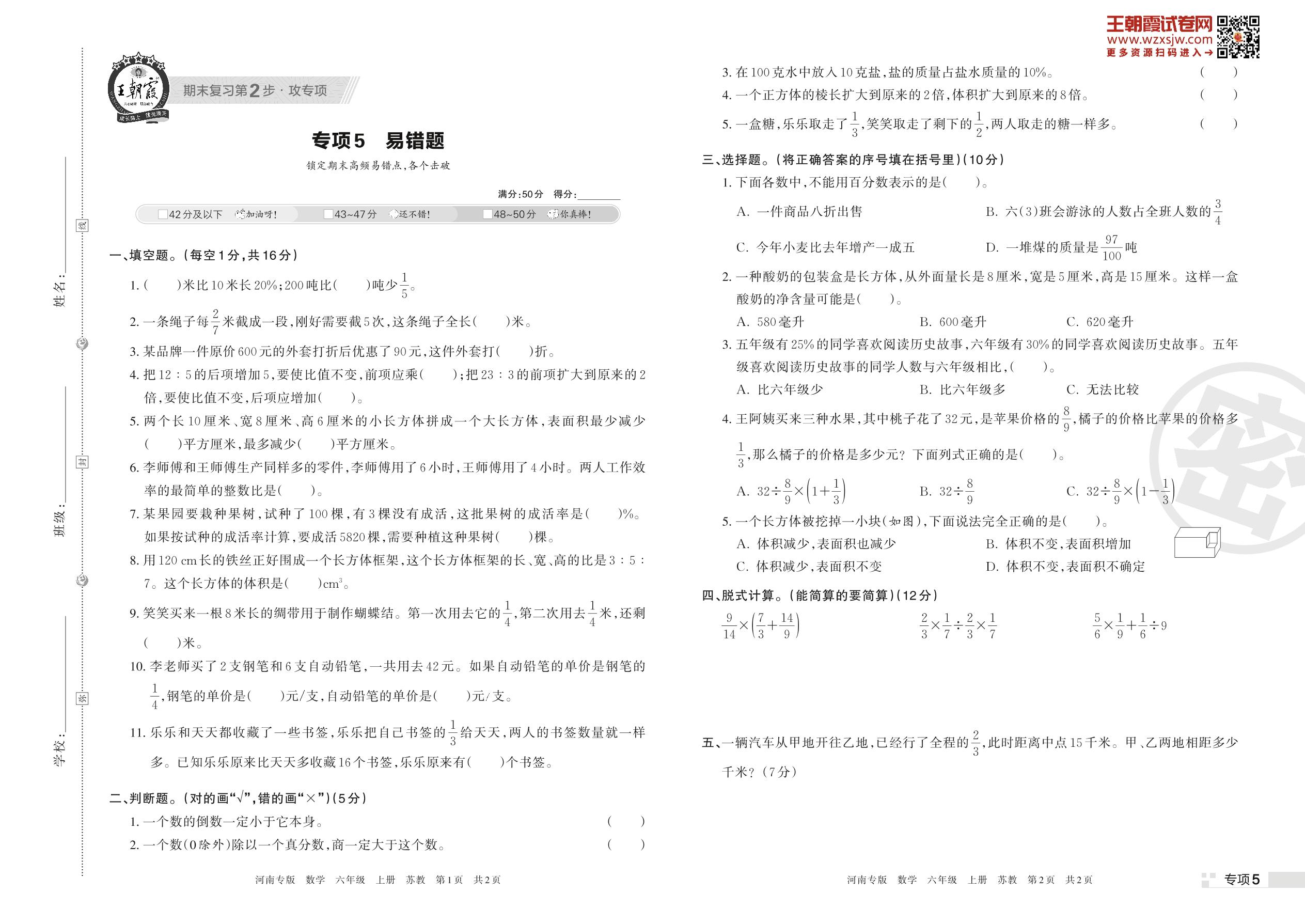 王朝霞期末专项卷——易错题六年级上册数学(苏教版)_R221112084050368【5】