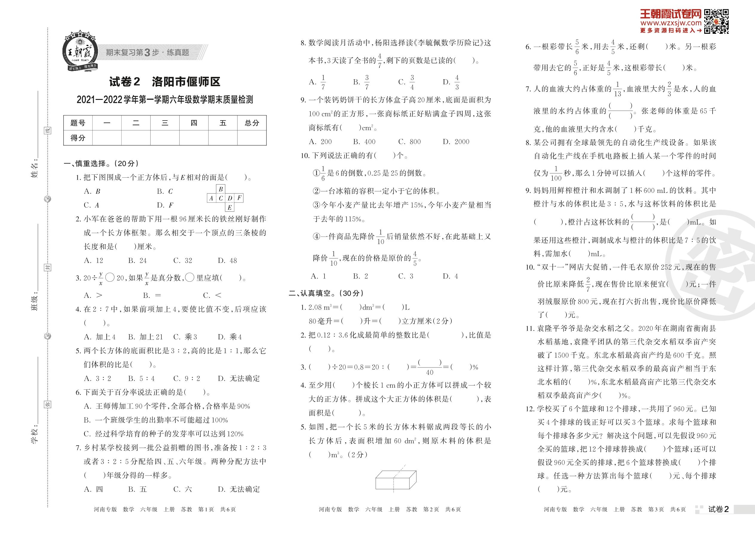 洛阳市偃师区2021—2022学年第一学期六年级数学期末质量检测(苏教版)【2】