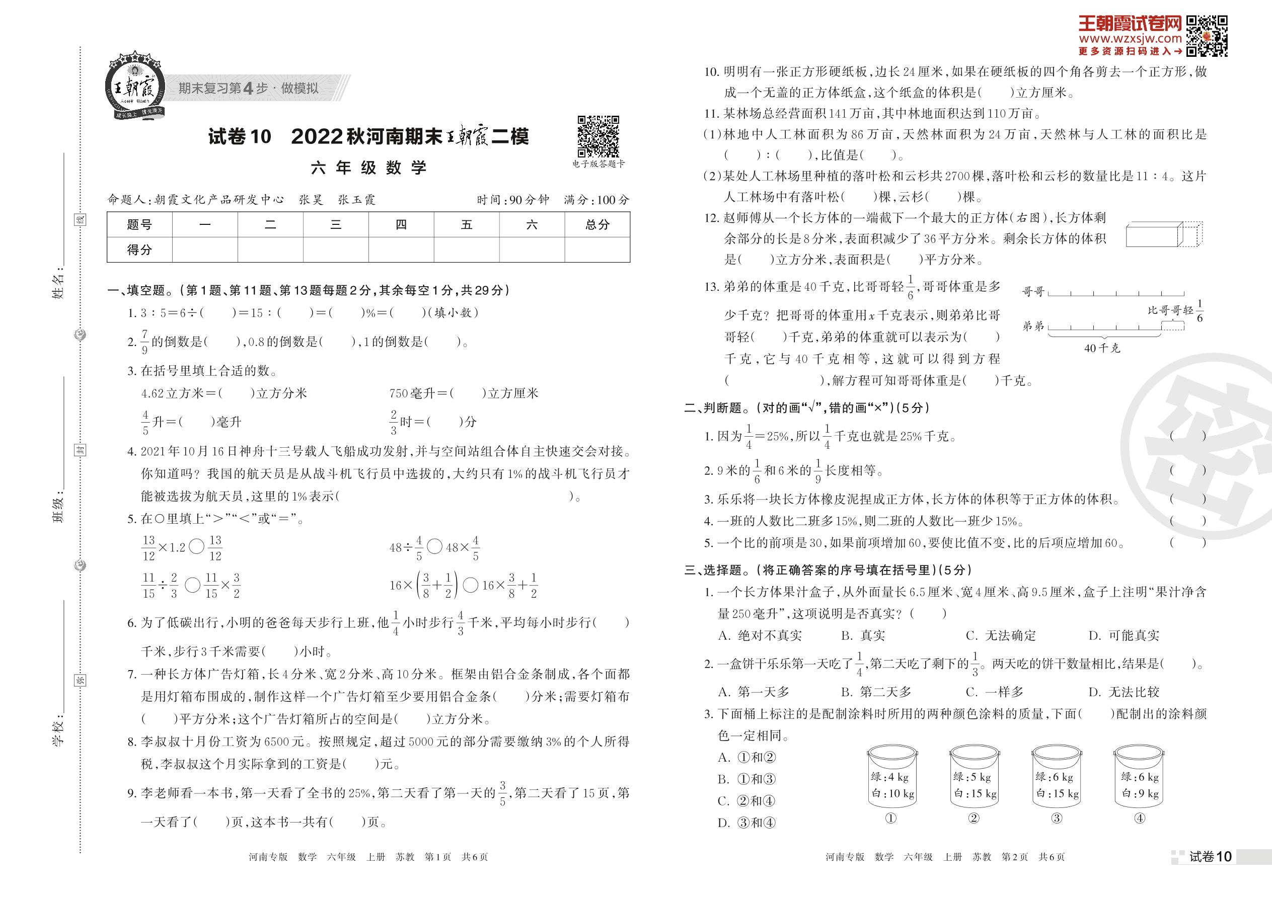 王朝霞期末模拟卷六年级上册数学(苏教版)_R221112084052046【10】