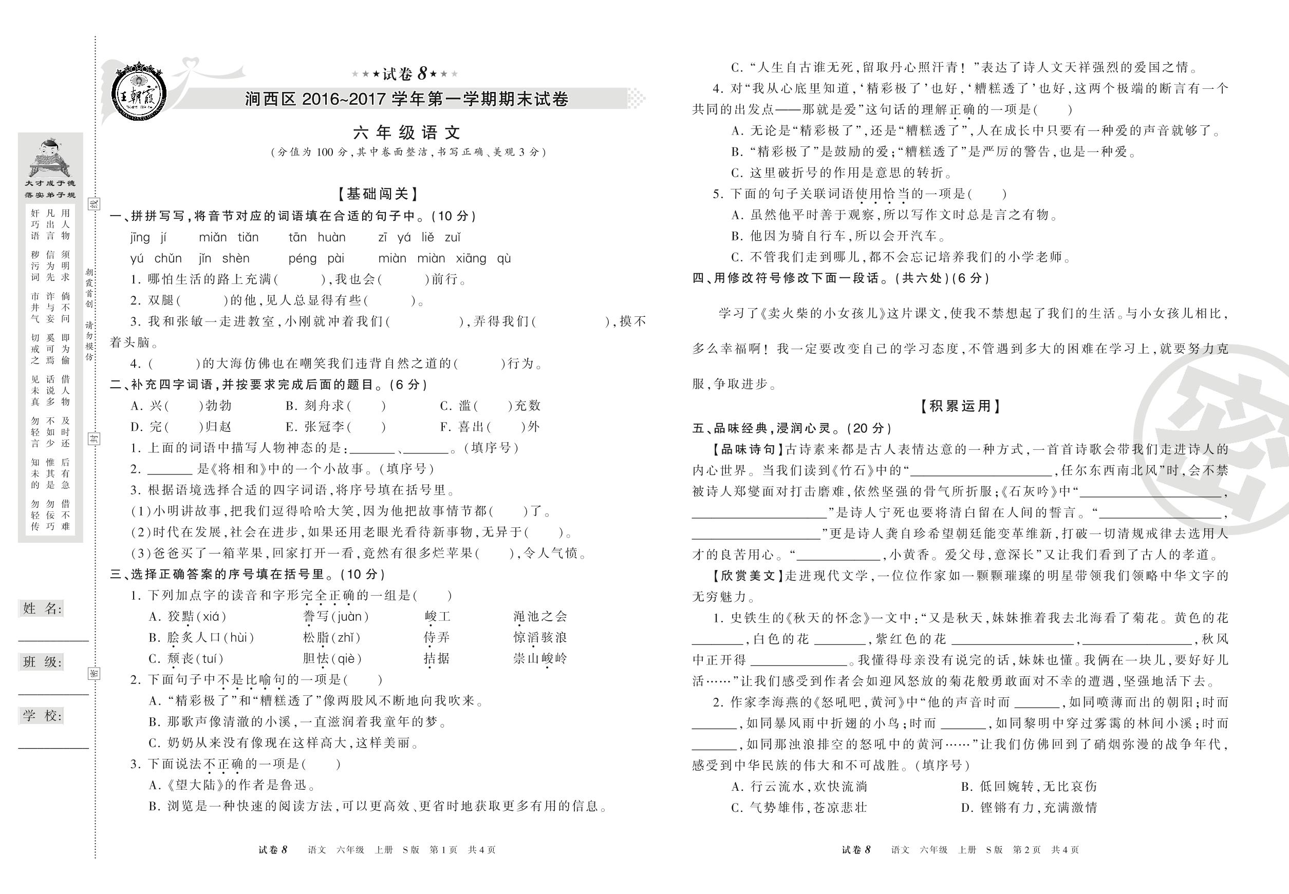 2016-2017学年第一学期洛阳市涧西区六年级语文试卷(S版)【8】