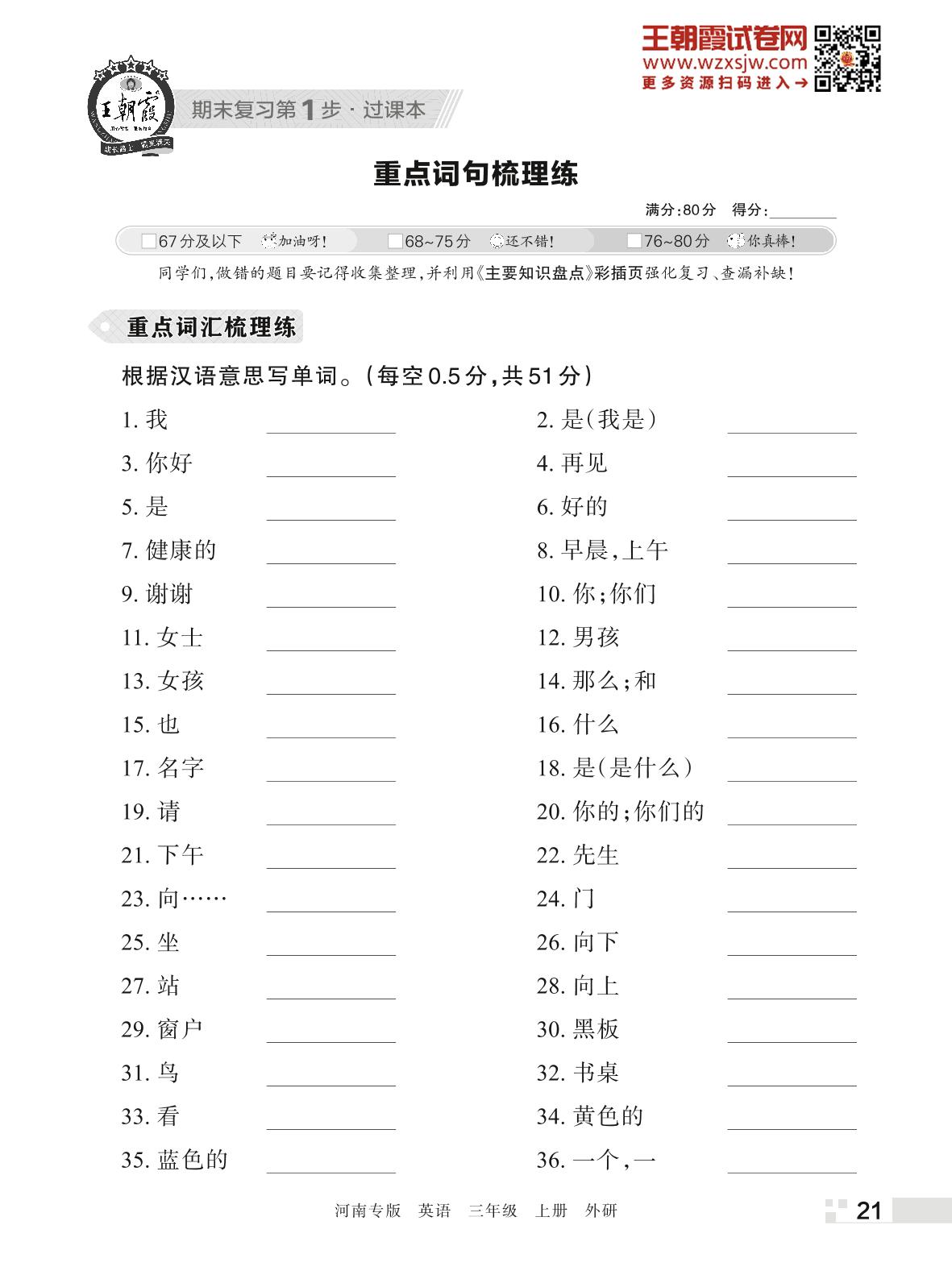 王朝霞期末过课本——重点词句梳理练三年级上册英语(外研版)_R221112101328472
