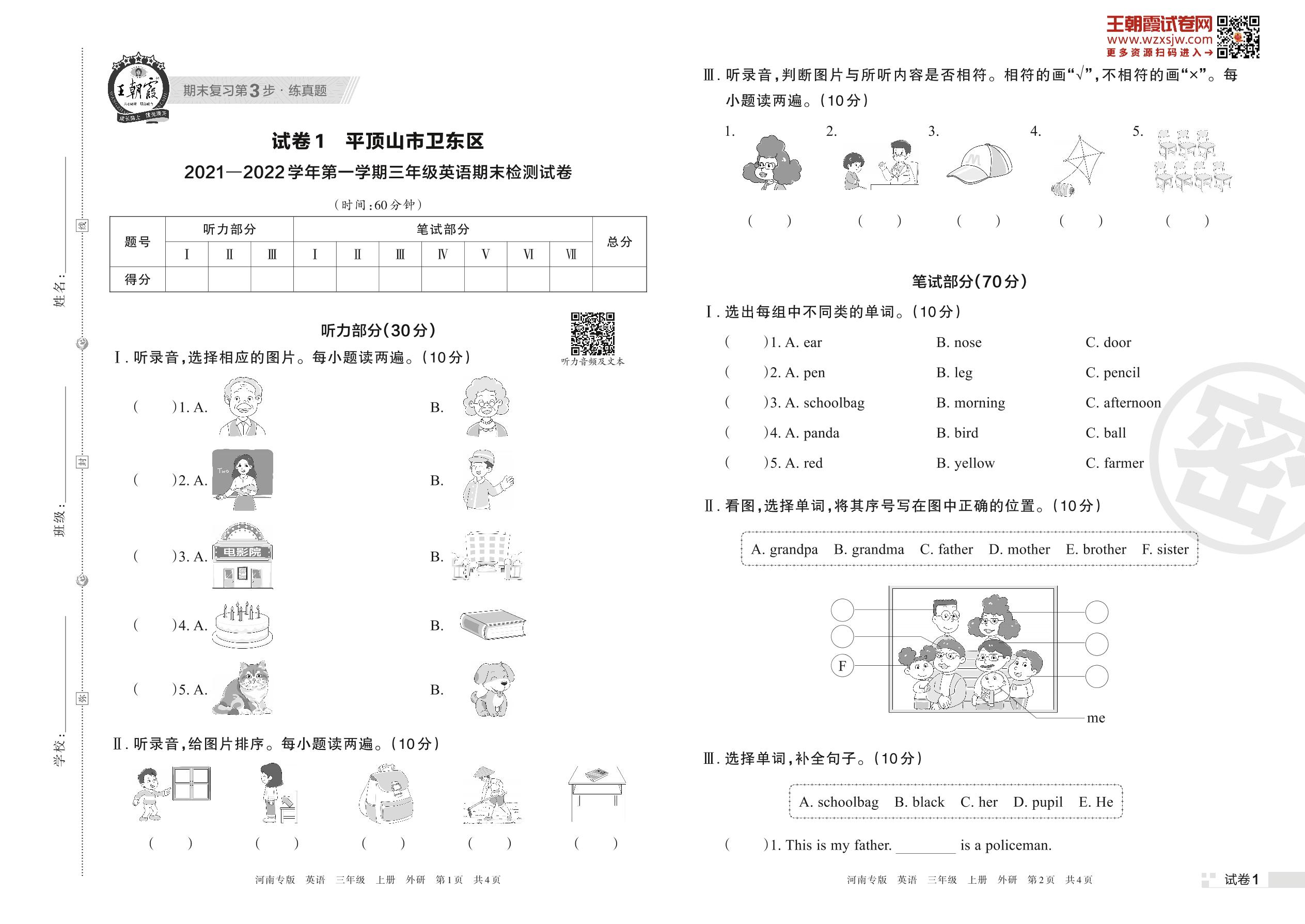平顶山市卫东区2021—2022学年第一学期三年级英语期末检测试卷(外研版)【1】