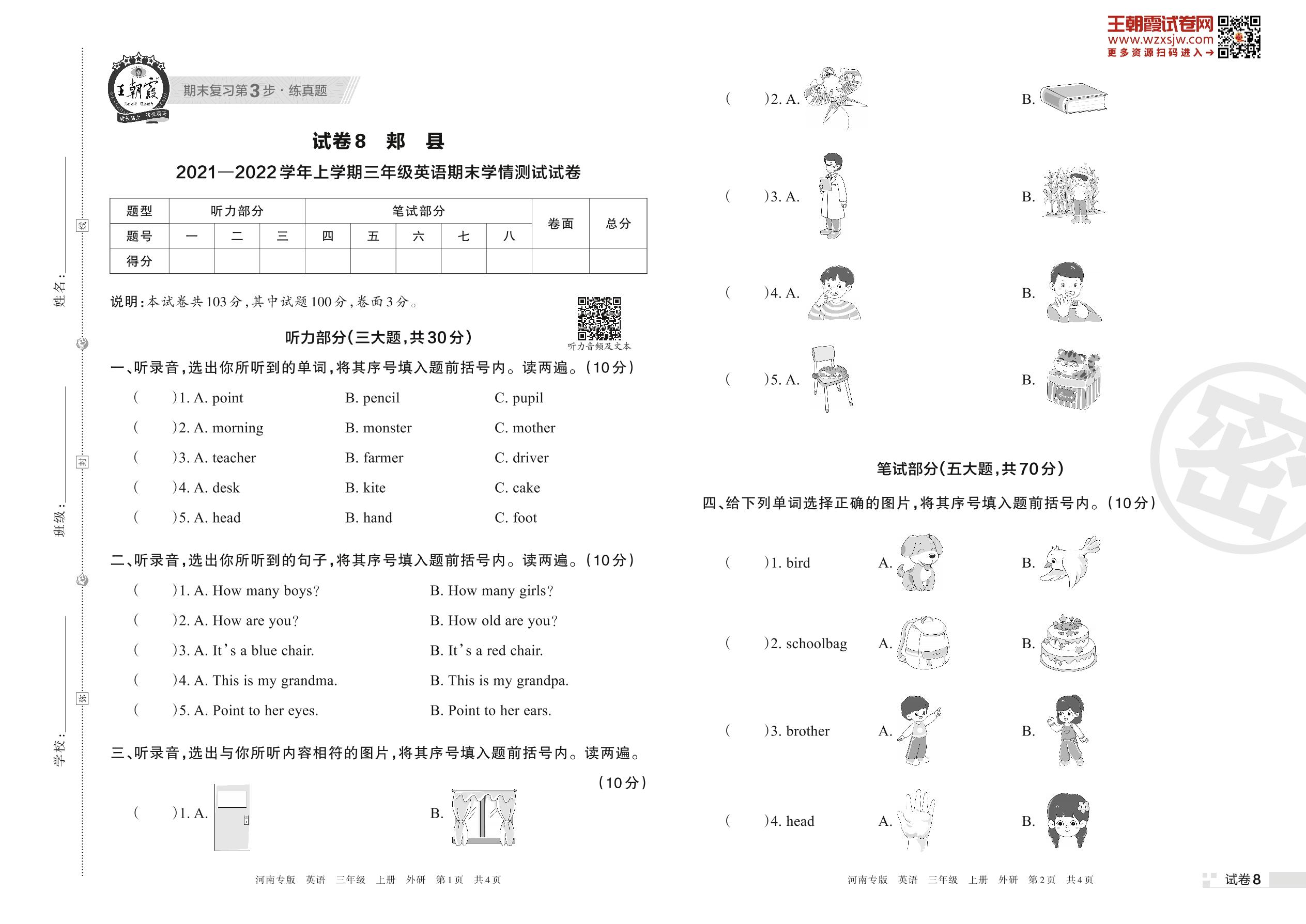 郏县2021—2022学年上学期三年级英语期末学情测试试卷(外研版)【8】