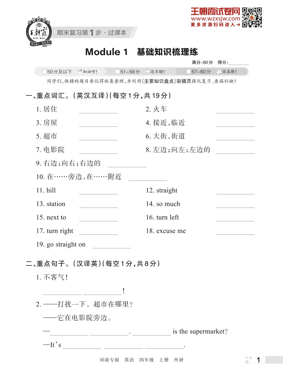 王朝霞期末过课本——Module 1 基础知识梳理练四年级上册英语(外研版)_R221112102310325