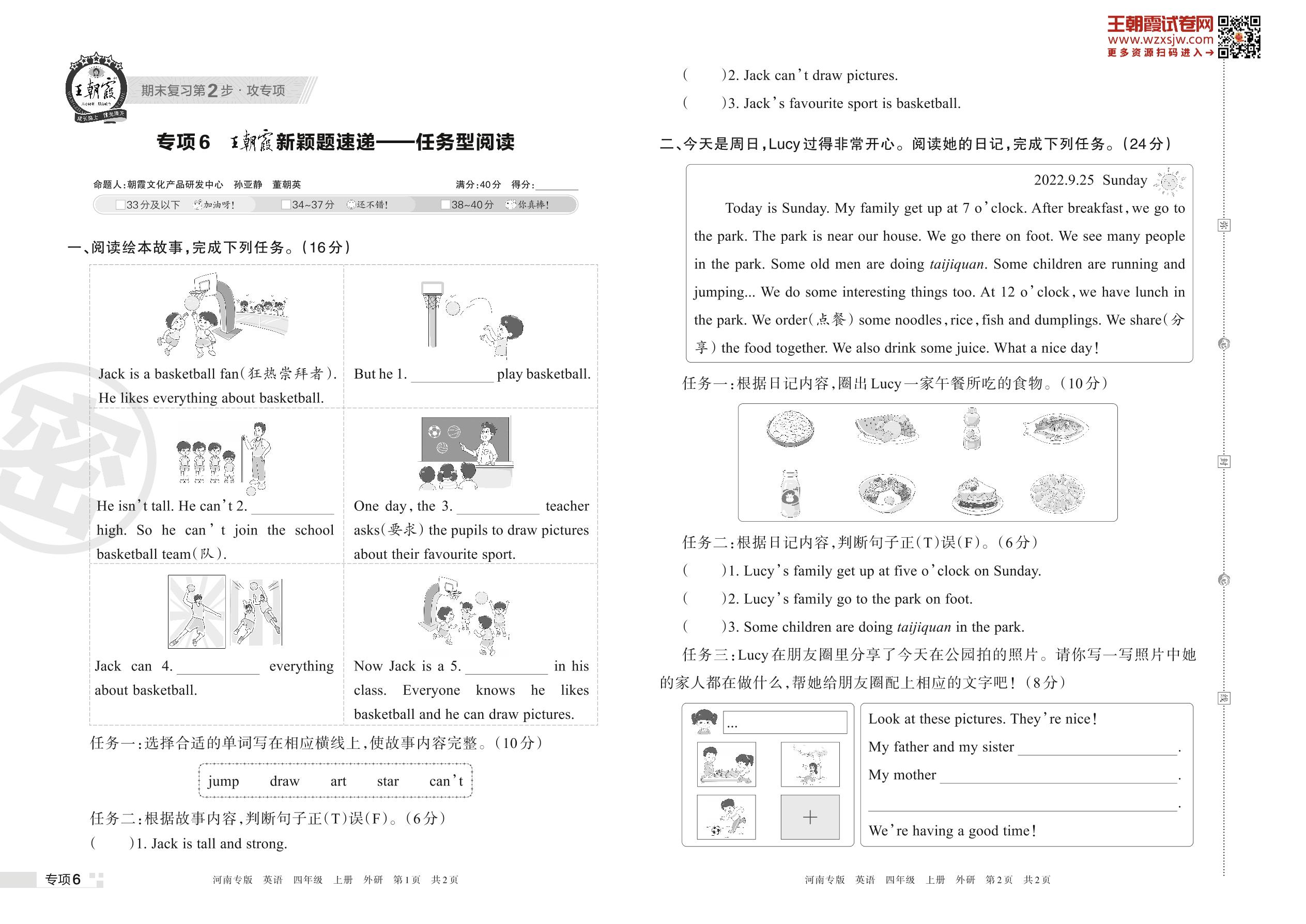 王朝霞期末专项卷——王朝霞新颖题速递:任务型阅读四年级上册英语(外研版)_R221112102311692【6】