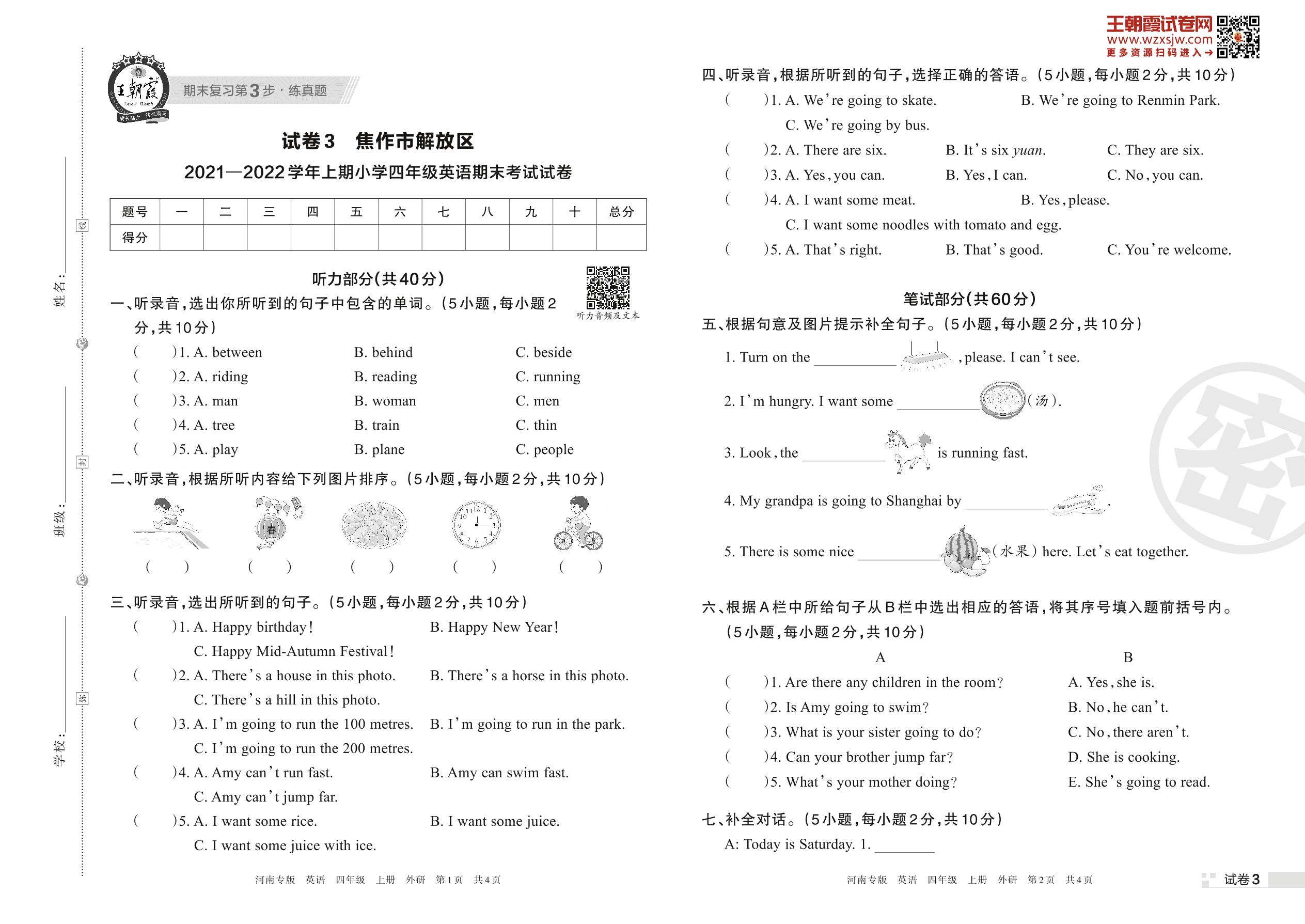 焦作市解放区2021—2022学年上期小学四年级英语期末考试试卷(外研版)【3】