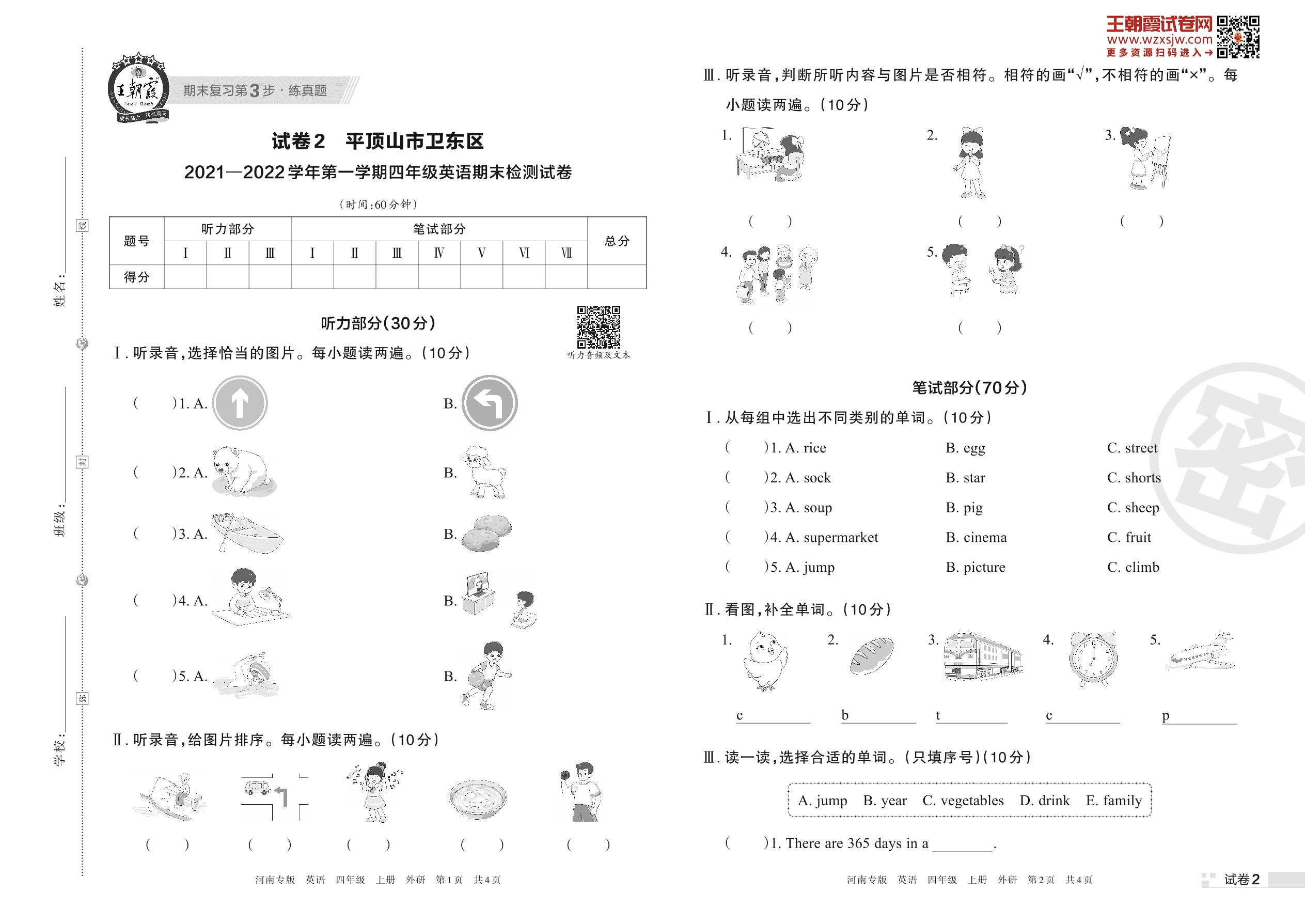 平顶山市卫东区2021—2022学年第一学期四年级英语期末检测试卷(外研版)【2】