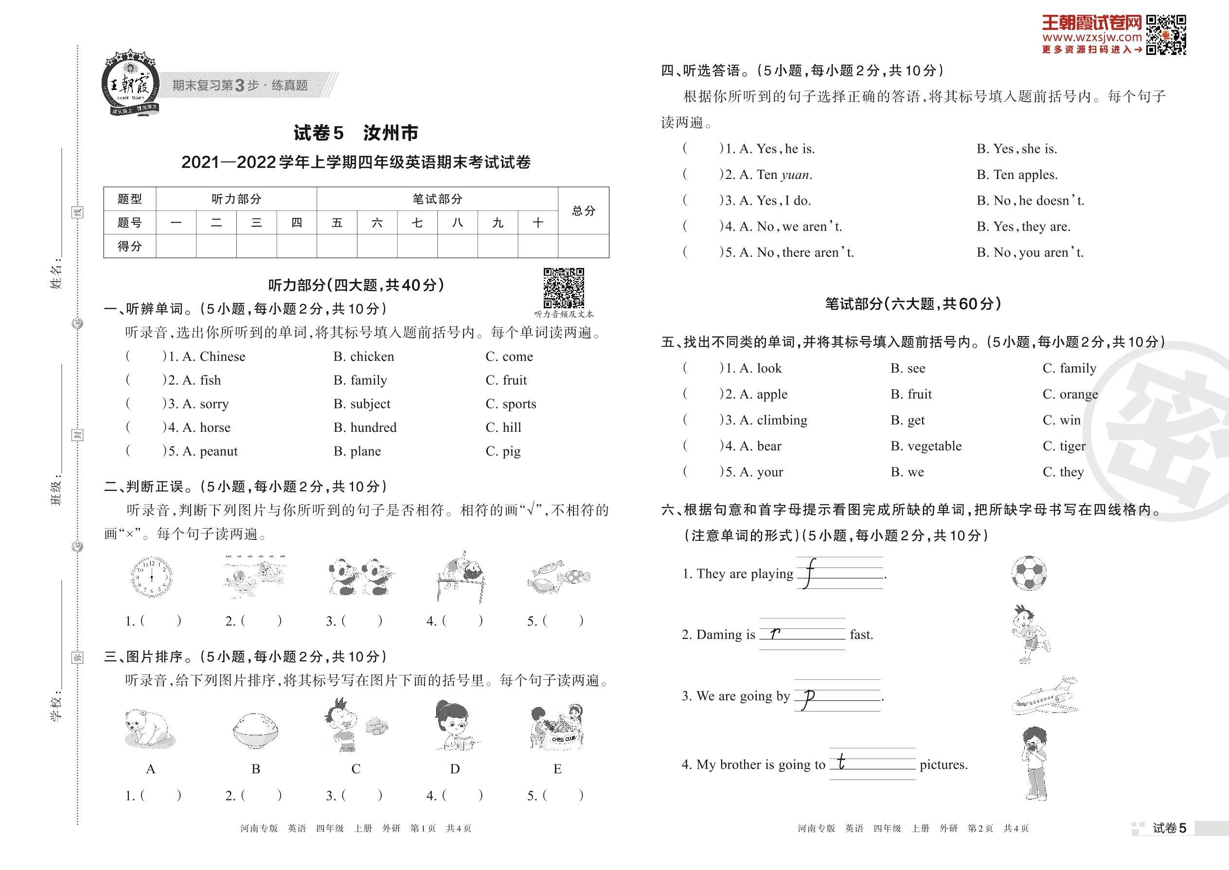 汝州市2021—2022学年上学期四年级英语期末考试试卷(外研版)【5】