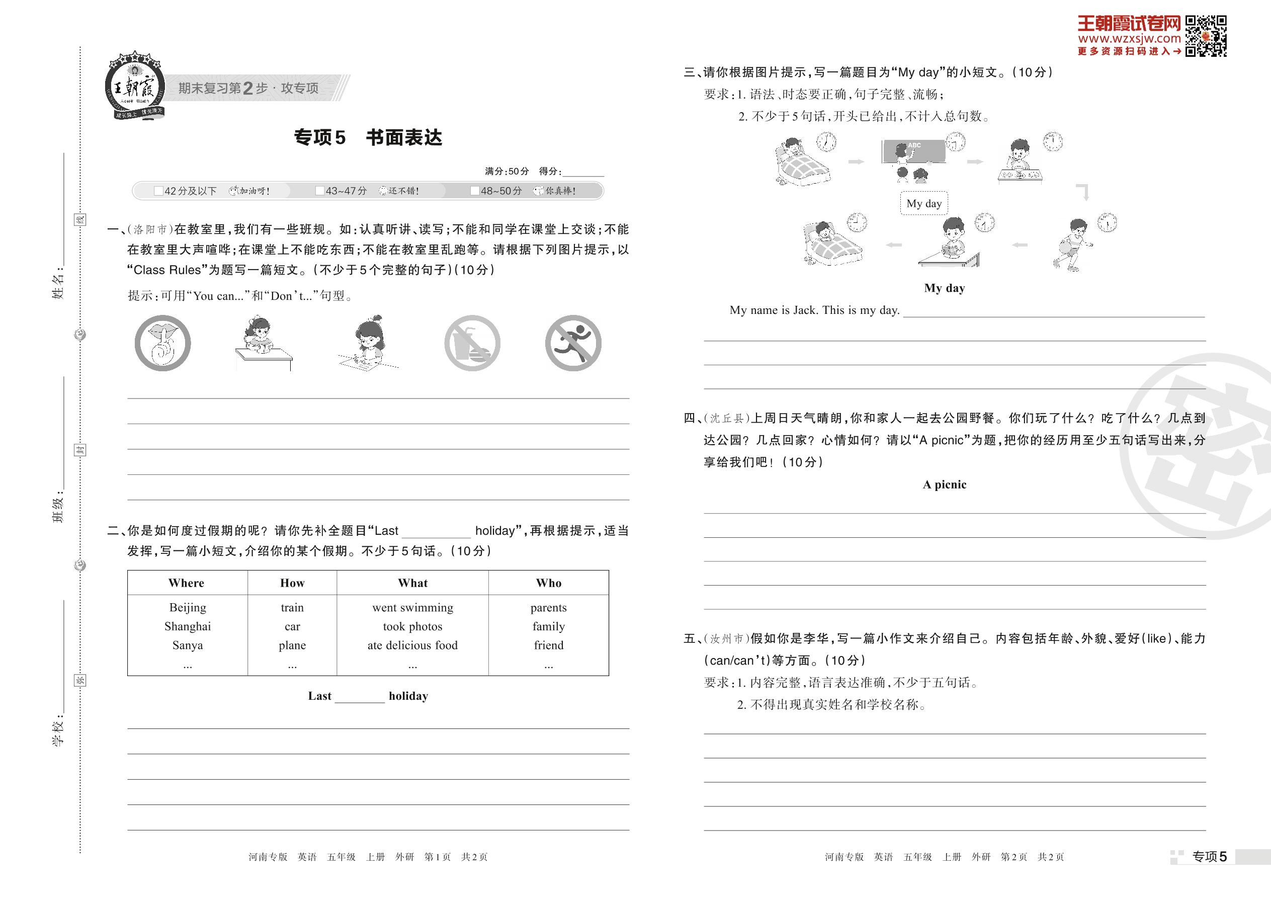 王朝霞期末专项卷——书面表达五年级上册英语(外研版)_R221112103158363【5】