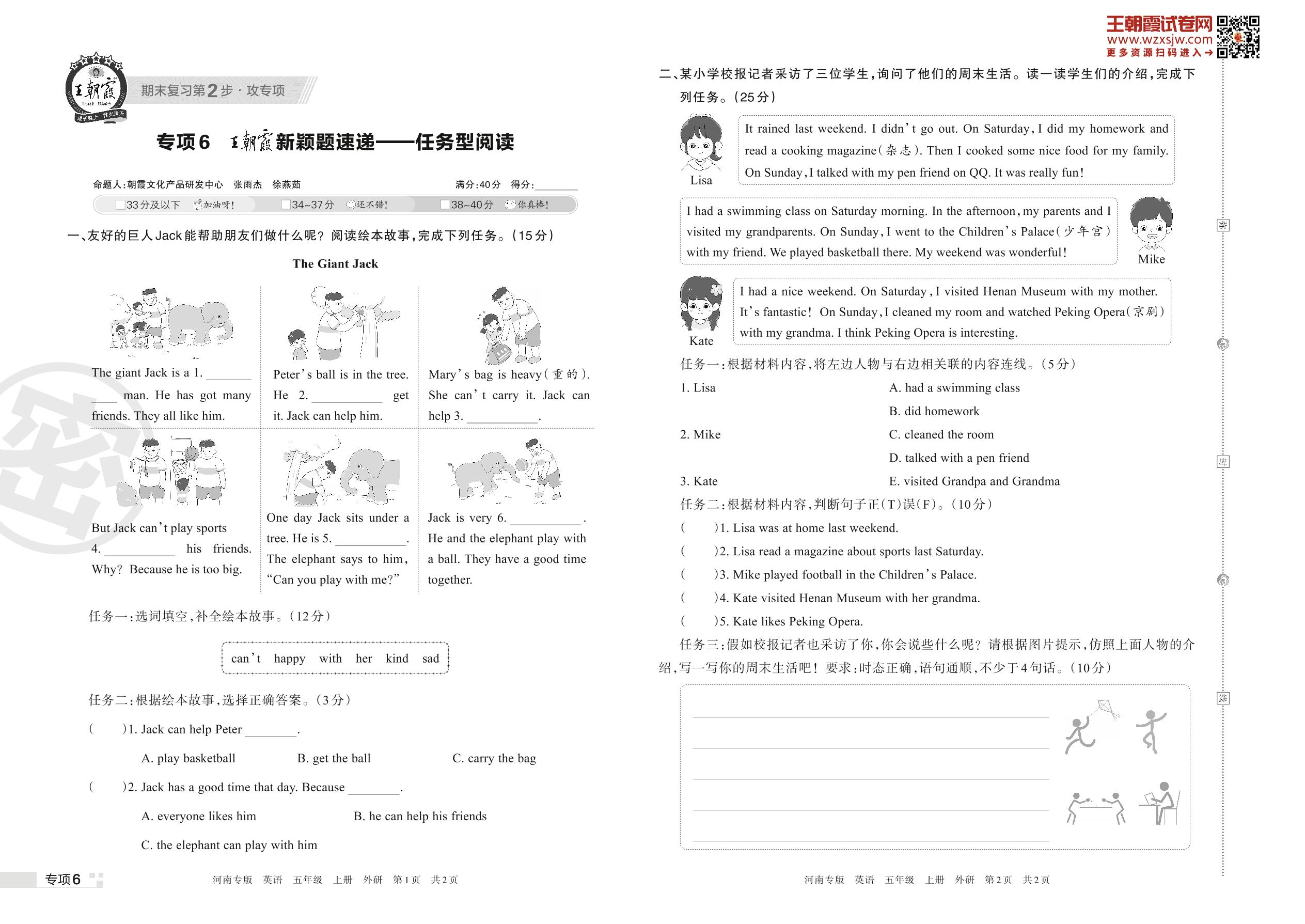 王朝霞期末专项卷——王朝霞新颖题速递:任务型阅读五年级上册英语(外研版)_R221112103158473【6】