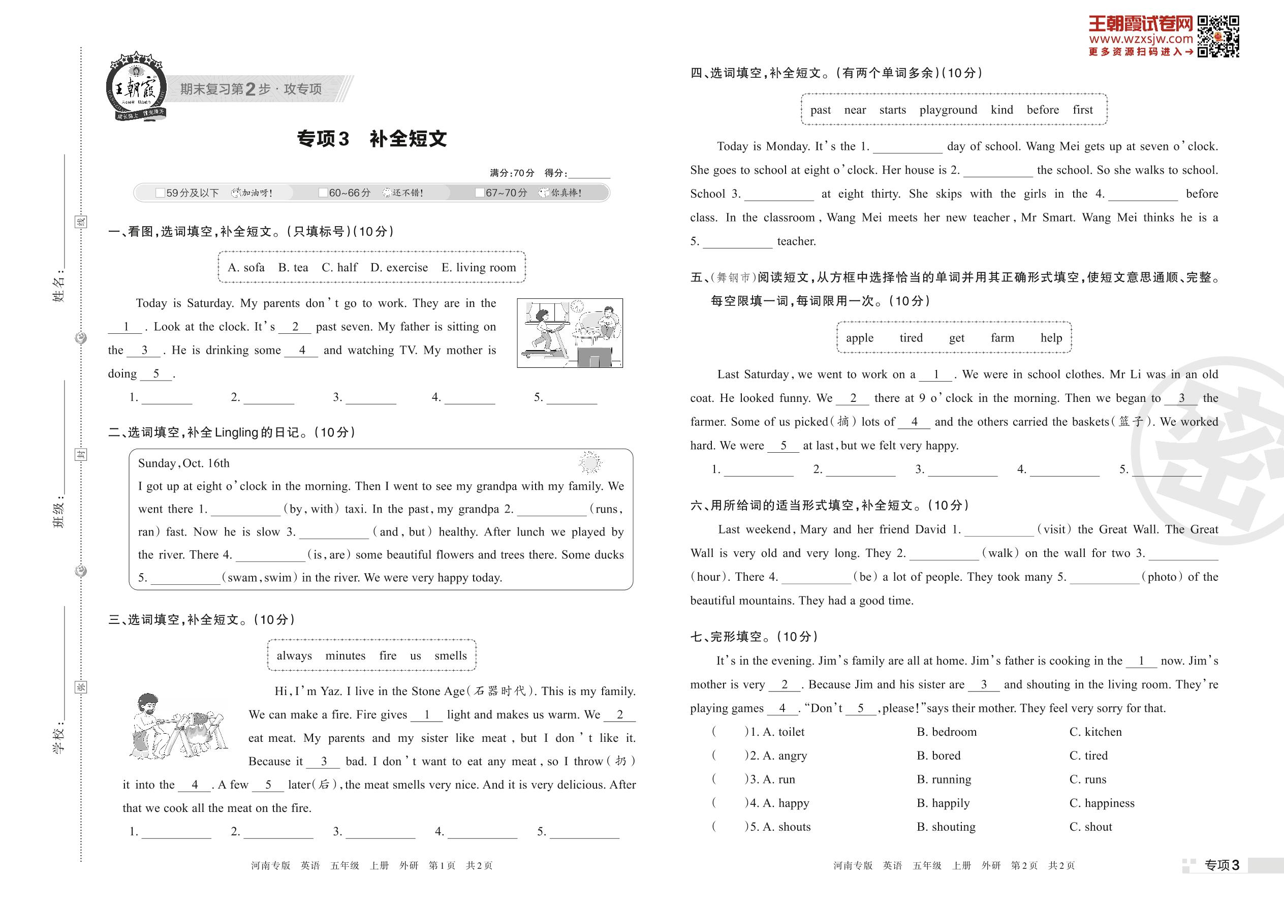 王朝霞期末专项卷——补全短文五年级上册英语(外研版)_R221112103159473【3】