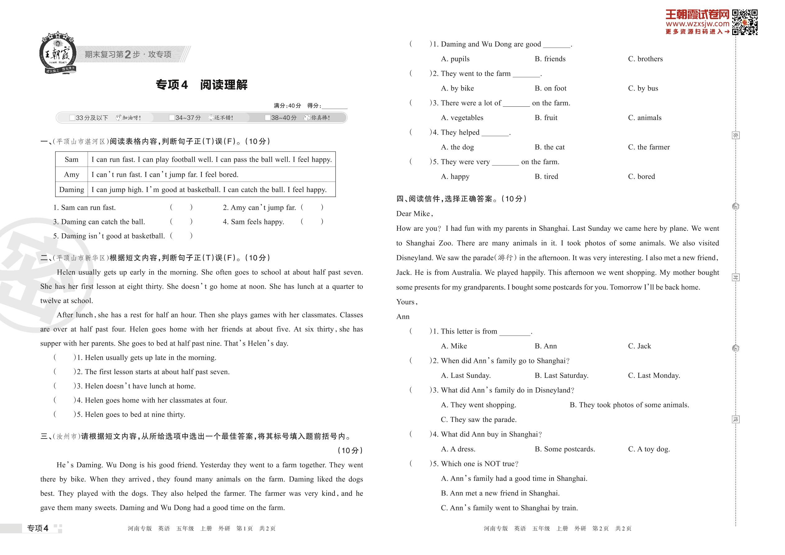 王朝霞期末专项卷——阅读理解五年级上册英语(外研版)_R221112103159651【4】