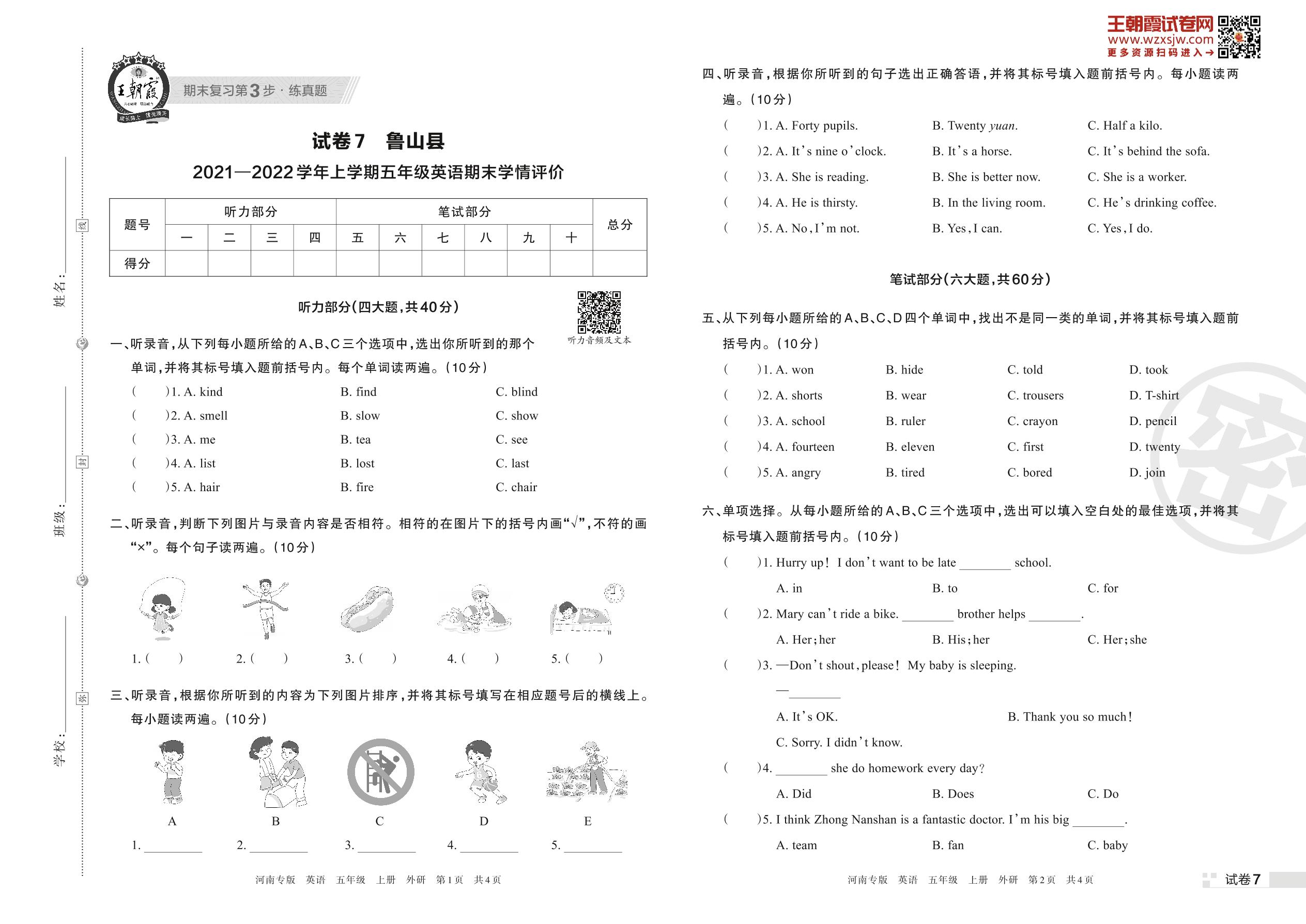 鲁山县2021—2022学年上学期五年级英语期末学情评价(外研版)【7】