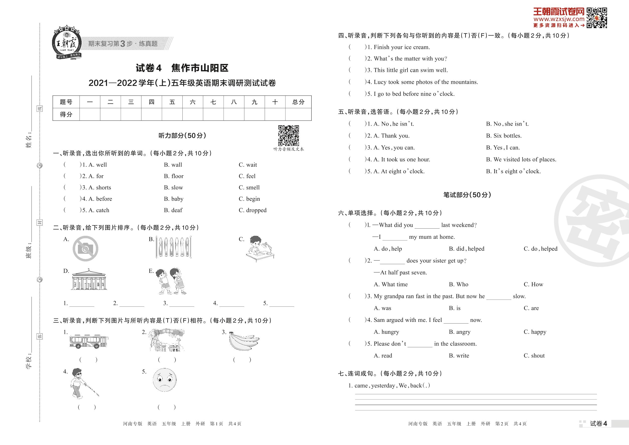 焦作市山阳区2021—2022学年(上)五年级英语期末调研测试试卷(外研版)【4】